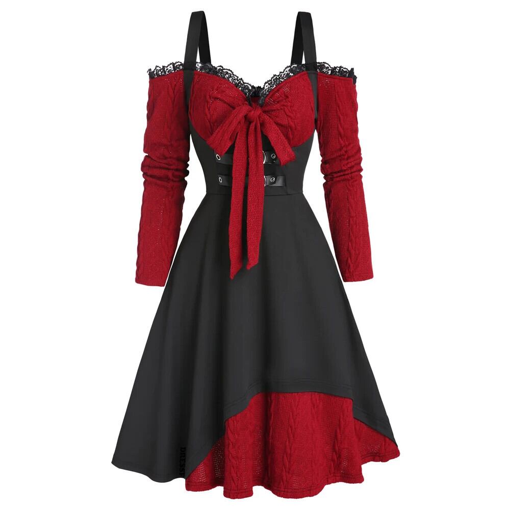 送料無料 Dressfo レディース コールド ショルダー 長袖ドレス カラーブロック ニット フェイク ツインセット レース トリム ちょう結び ケーブル ニット Jurken ロング リボン ファー AE1212665655667400532896