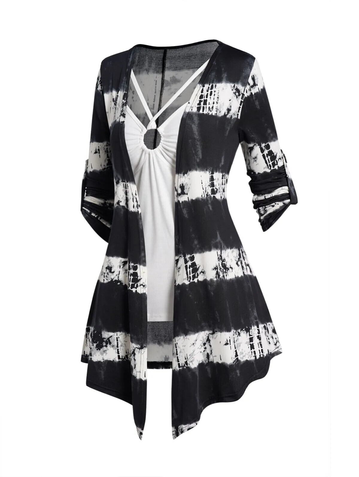 送料無料 女性のお出かけ秋タイダイストライププリントオープンフロントロングトップと無地Oリングストラップキャミソールセット 指輪 AE12126656556851993316