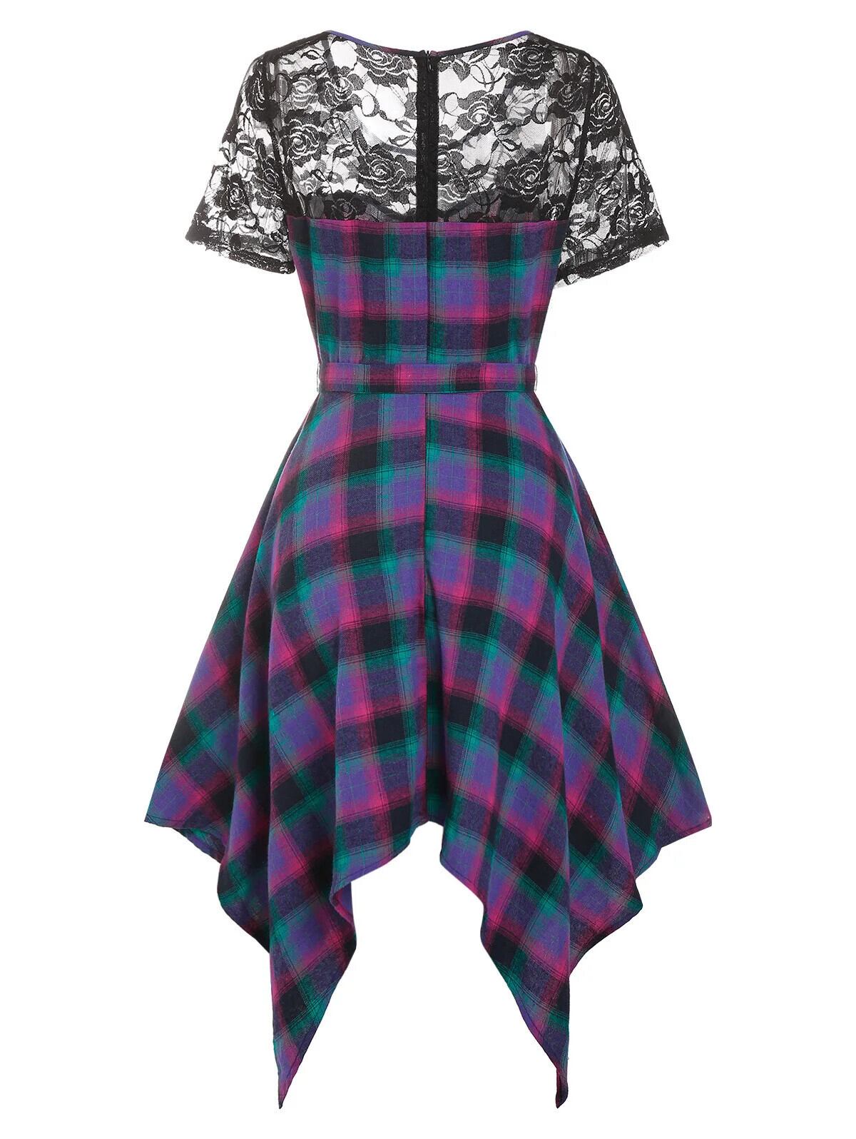 送料無料 シースルーショルダーヴィンテージセルフタイチェック柄花レースパネル不規則なミディドレス女性夏デイリー サマー 夏物 花柄 ビンテージ AE1212665655696394043561