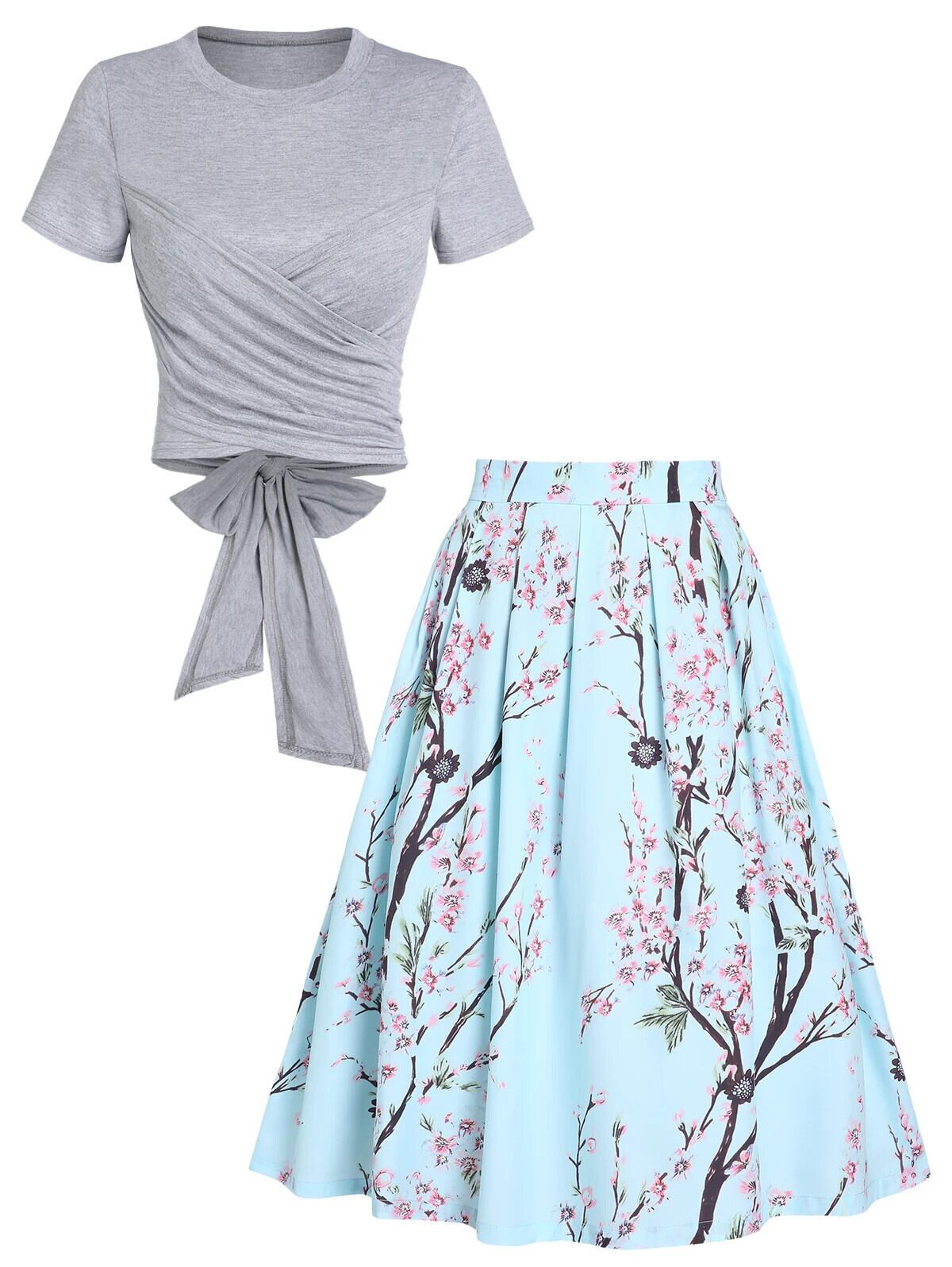 送料無料 カットアウト冥衣ちょう結び T シャツと花柄レースオーバーレイロースカート衣装ツーピース衣装バイカラー T シャツディップヘムスカート リボン Tシャツ AE1212665655681846399188