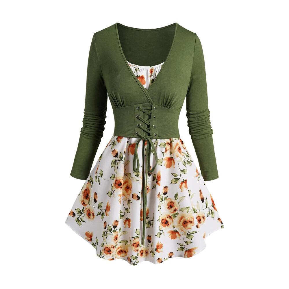 送料無料 レースアップ サープライス プランジ長袖クロップトップとフラワー プリント スパゲッティ ストラップ キャミソール セット ロング フラワーデザイン AE1212665655692965559931