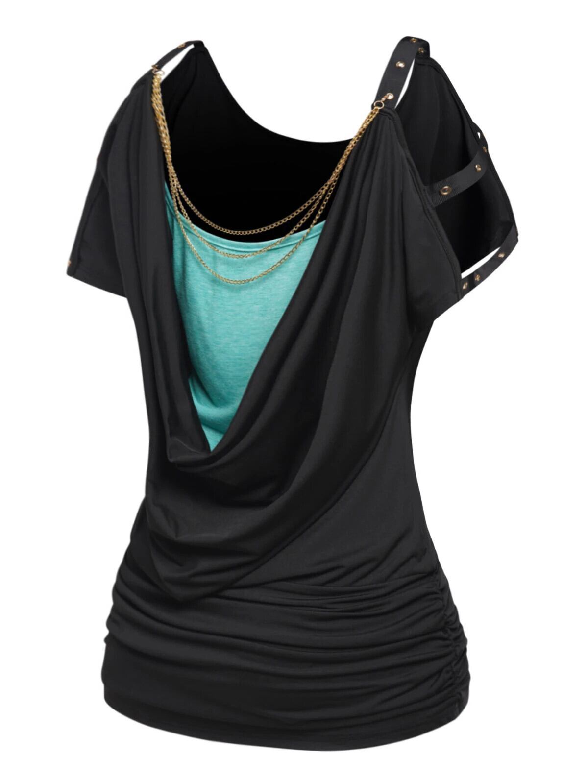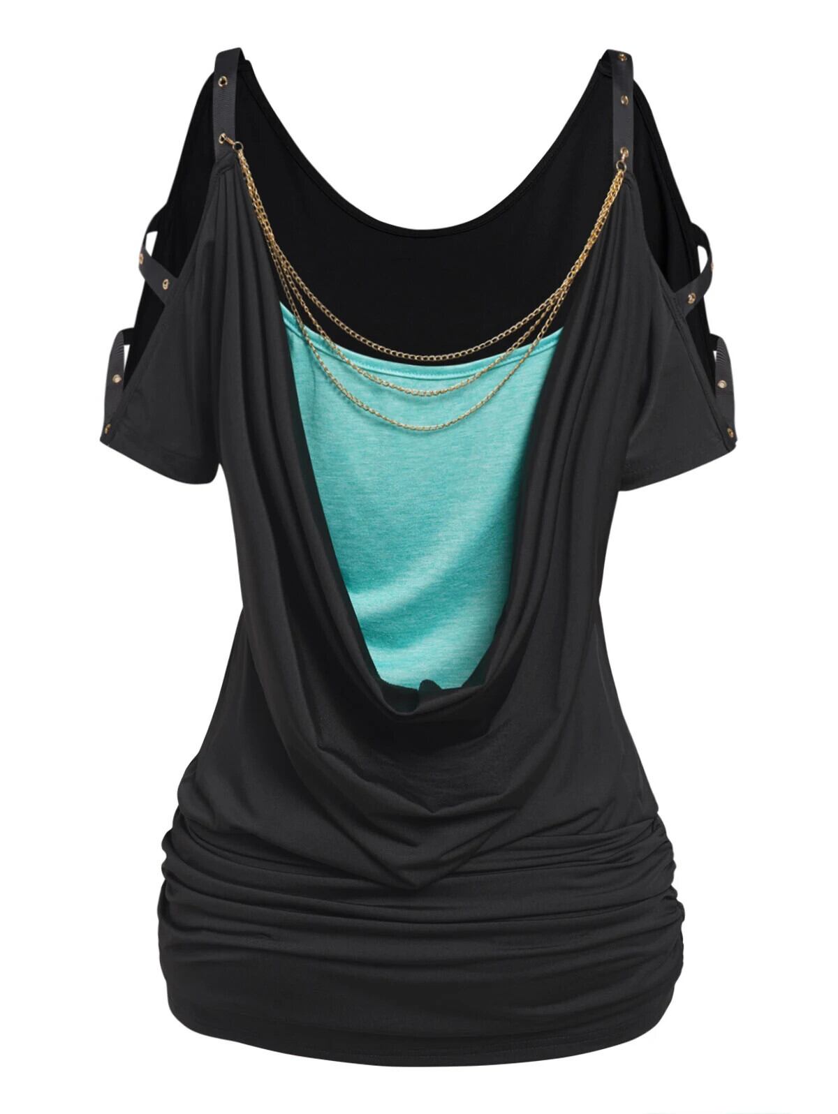 送料無料 デイリーコールドショルダーカウルネックカラーブロックフェイクツインセットトップス女性夏のチェーンディテールシャーリングロングTwofer Tシャツ サマー 夏物 ファー AE1212665655644561884020