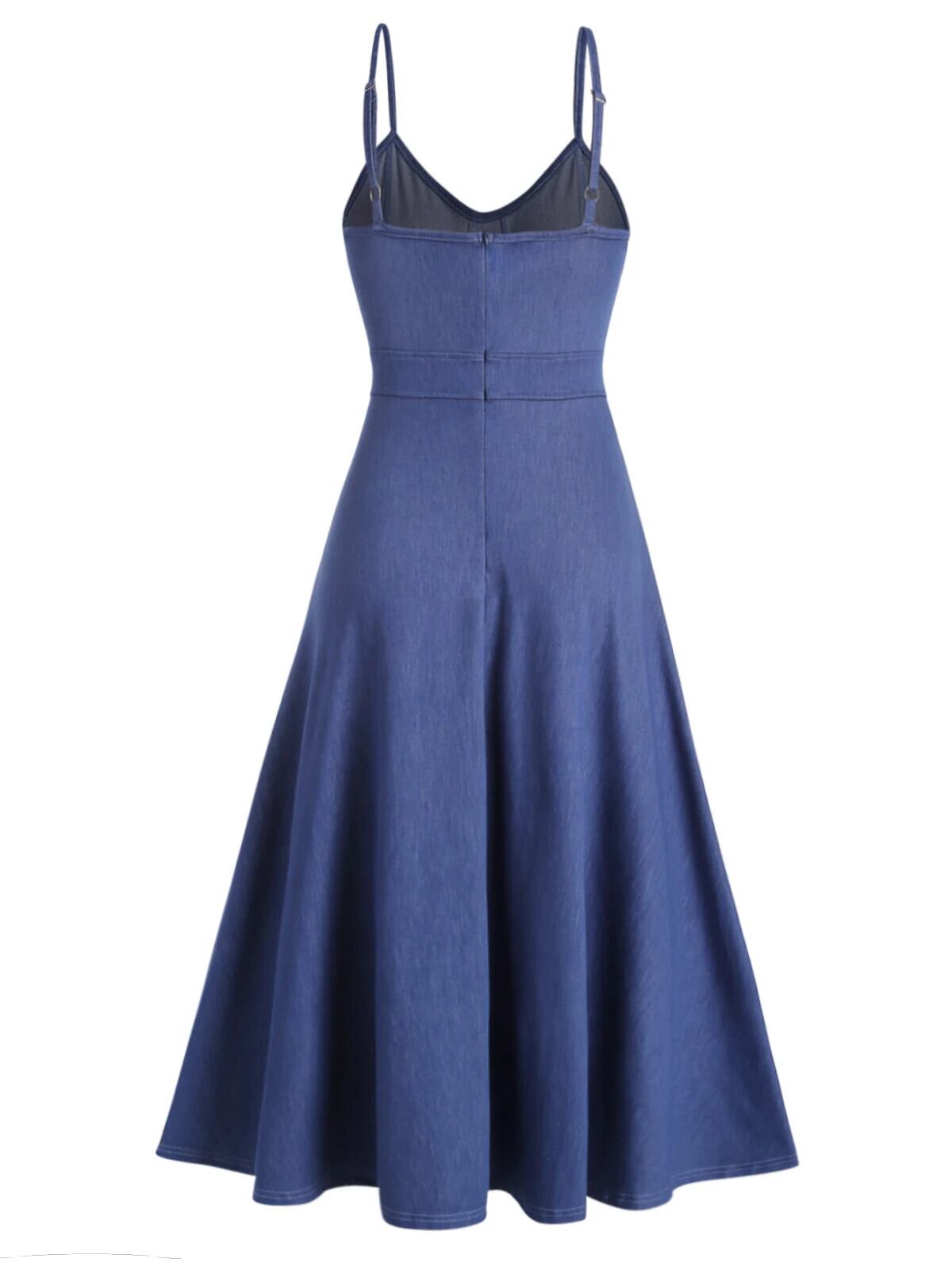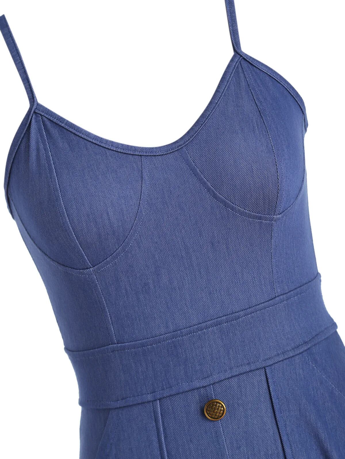 送料無料 ミディニットデニムサンドレスポケット付きソリッドカラーモックボタンウエストドレスサマーブルーノースリーブローブ女性 夏物 AE1212665655687334332167