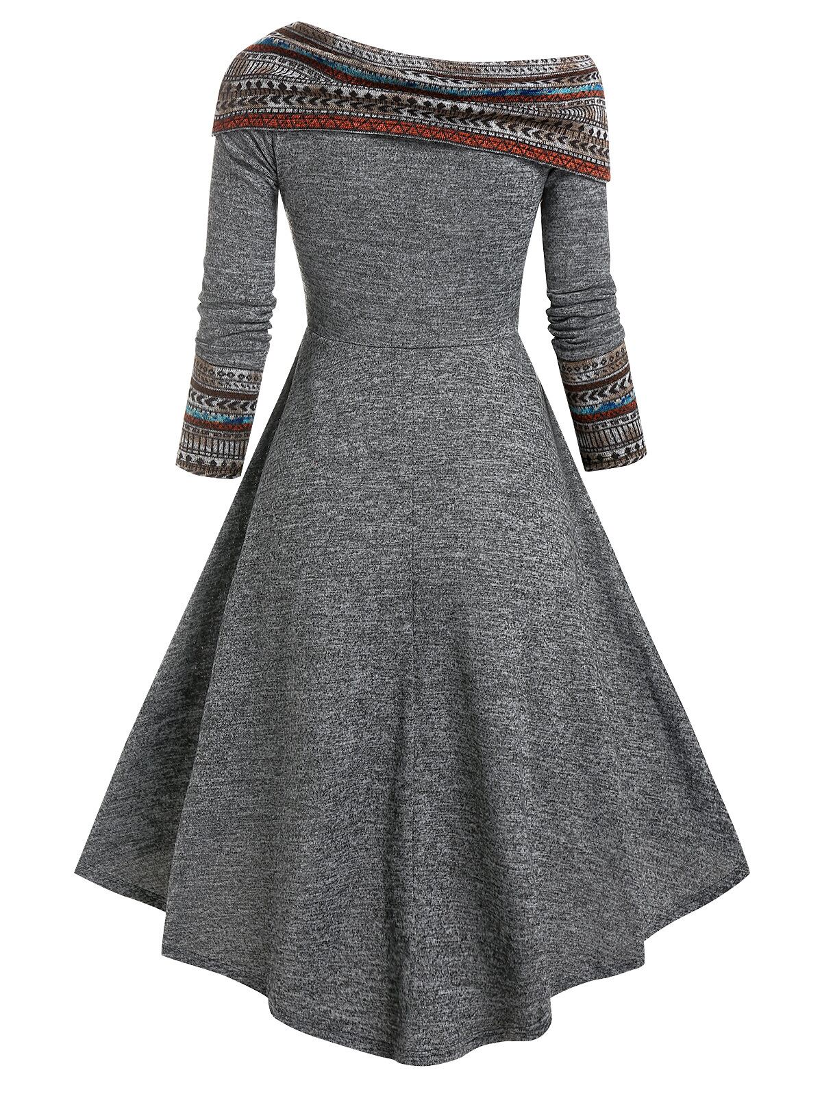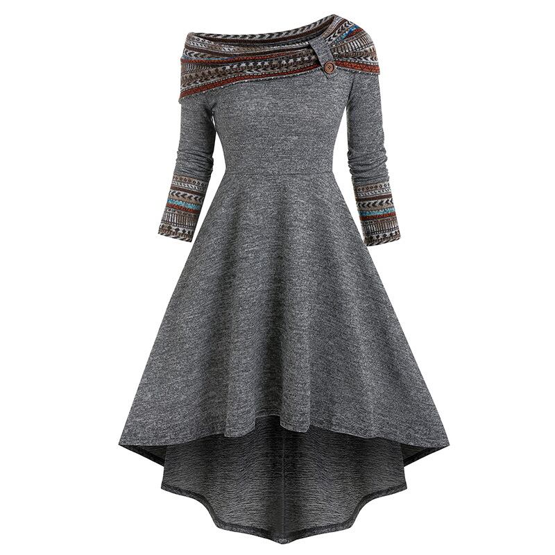 送料無料 秋長袖ドレス女性スキューネック部族プリントローミディドレスミディ不規則な折り返し Vestido Feminino ロング AE1212665655663449237751