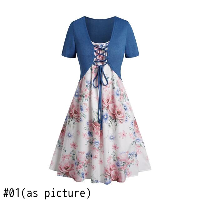 送料無料 女性総花プリント スパゲッティ ストラップ ドレスとレースアップ クロップド トップ衣装 2 点セット フラワーデザイン AE1212665655622535004817
