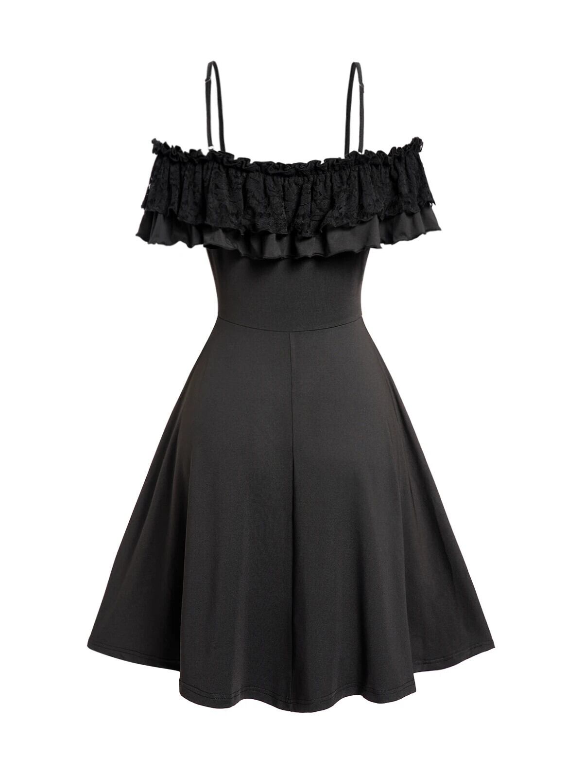 送料無料 女性ブラックカラースパゲッティストラップコールドショルダードレスフリルストレッチ折り返し A ラインミニローブパーティーデート Aライン AE1212665655660099534584 | 女性の為の通販サイト-fashion navi