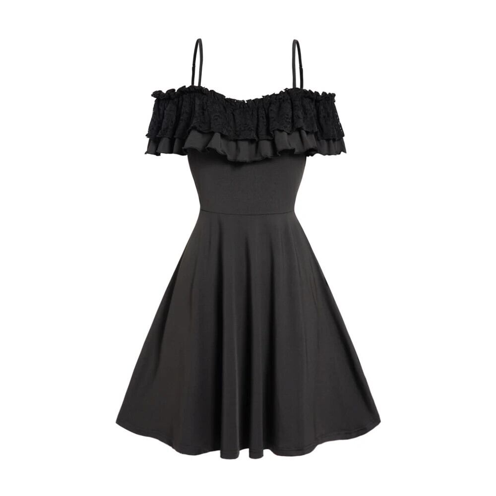 送料無料 女性ブラックカラースパゲッティストラップコールドショルダードレスフリルストレッチ折り返し A ラインミニローブパーティーデート Aライン AE1212665655660099534584