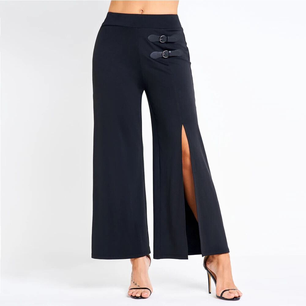 送料無料 ソリッドカラースリットワイドレッグバックルストラップロングルーズパンツ女性キャバレー締めつけ 70 年代ディスコ水たまりパンツ ワイドパンツ AE1212665655614870576556