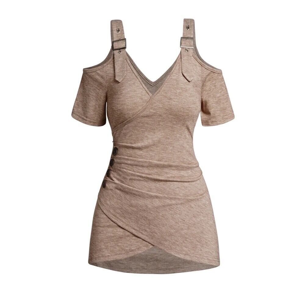 送料無料 コールドショルダークロスオーバートップスレディシャーリングモックボタンバックルストラップVネックヘザーソフトTシャツ レッド AE1212665655686509495154