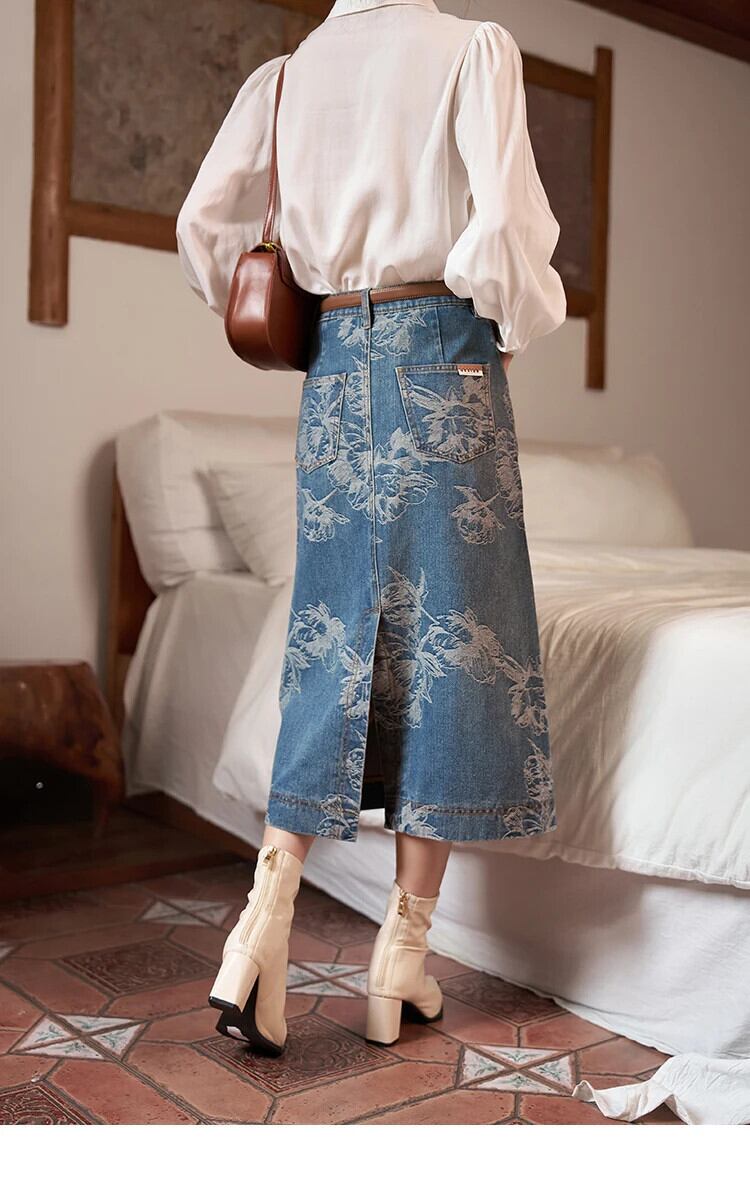送料無料 MISHOW デニムジャカード気質スカートの女性 2023 秋裾スプリットバックウエストレトロスカート MXC41B0101 オータム 秋物 AE12125556677665452176428