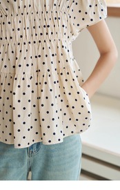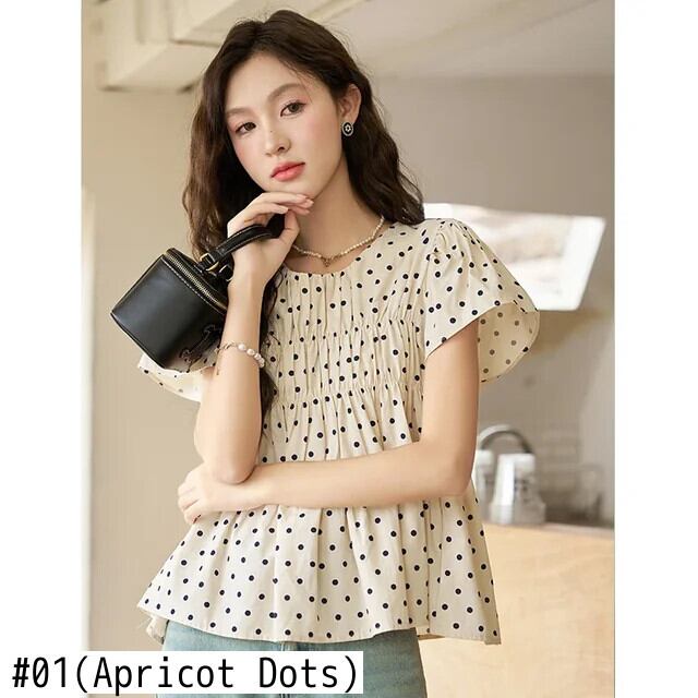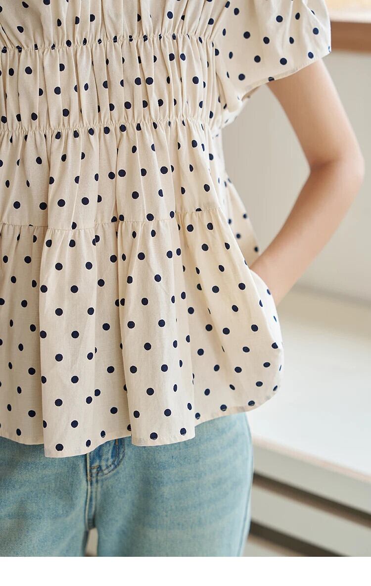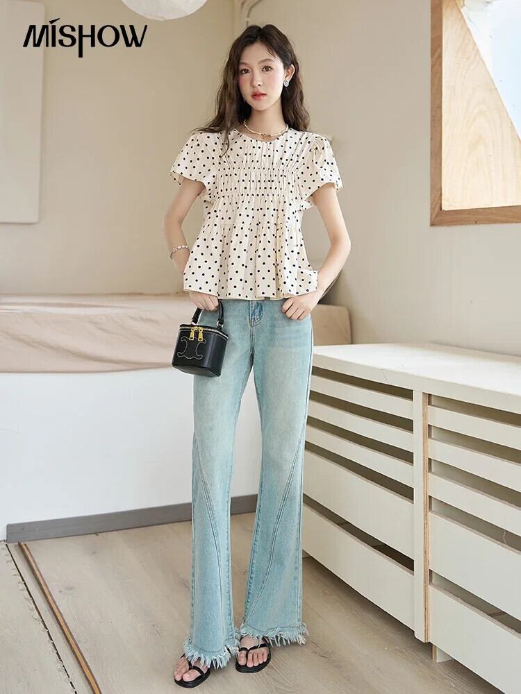 送料無料 MISHOW 水玉ブラウス女性 2023 夏フレンチフライングスリーブ O ネック弾性ひだルーズレトロドールトップ MXC39X1291 エラスティック 伸縮 サマー 夏物 Oネック AE12125556677630708785529