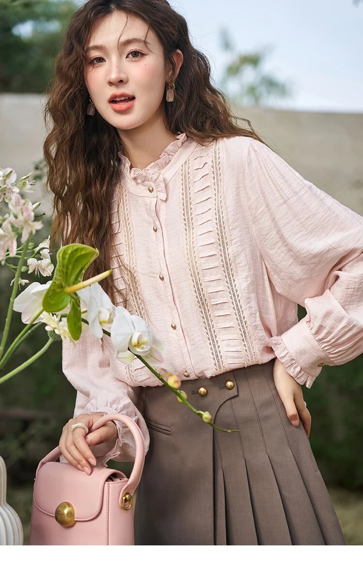 送料無料 MISHOW フレンチレトロパッチワークレースピンクシャツ女性春 2024 真菌エッジネック花びらスリーブトップスオフィスレディ MXD12C0162 スプリング 春物 会社 学校 通勤や通学にも AE12125556677698601453022