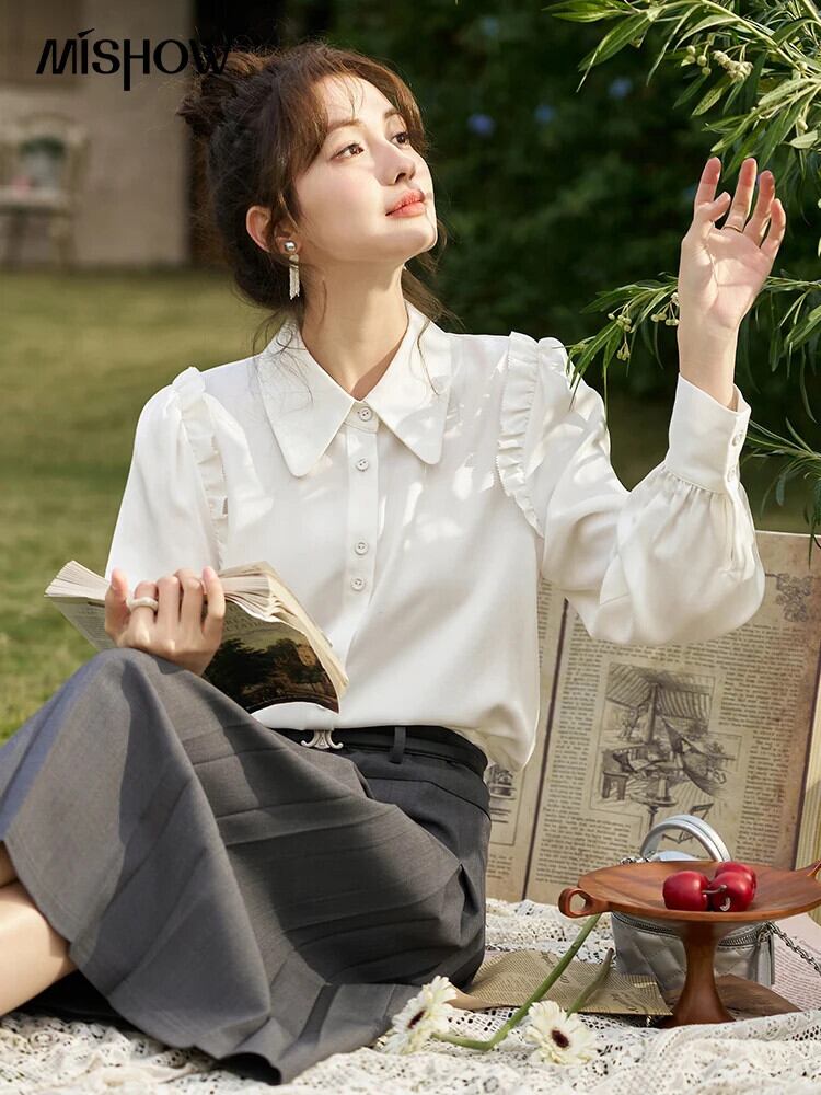 送料無料 MISHOW リヨセル 100% 気質白シャツ 2024 春肩菌エッジターンダウン襟パフスリーブトップ MXD12C0150 ホワイト スプリング 春物 AE1212555667766329879180
