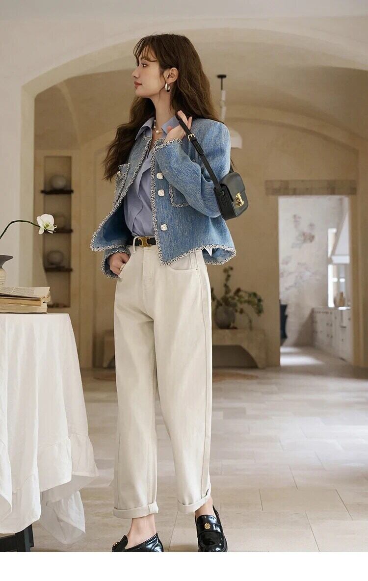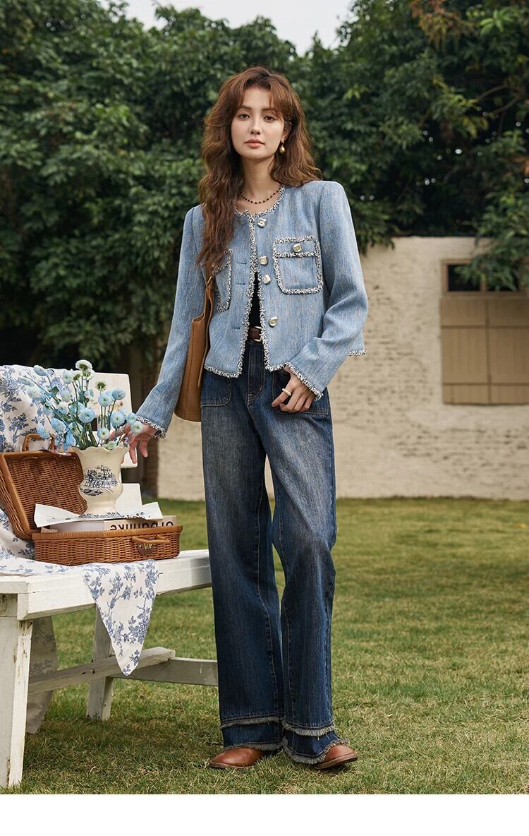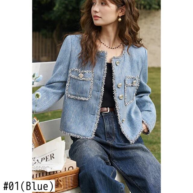 送料無料 MISHOW フレンチブルージャケット女性 2024 春シックなボタンポケット O ネックルーズコントラストリボンスプライシングコート MXD15W0348 スプリング 春物 Oネック AE12125556677668087730906