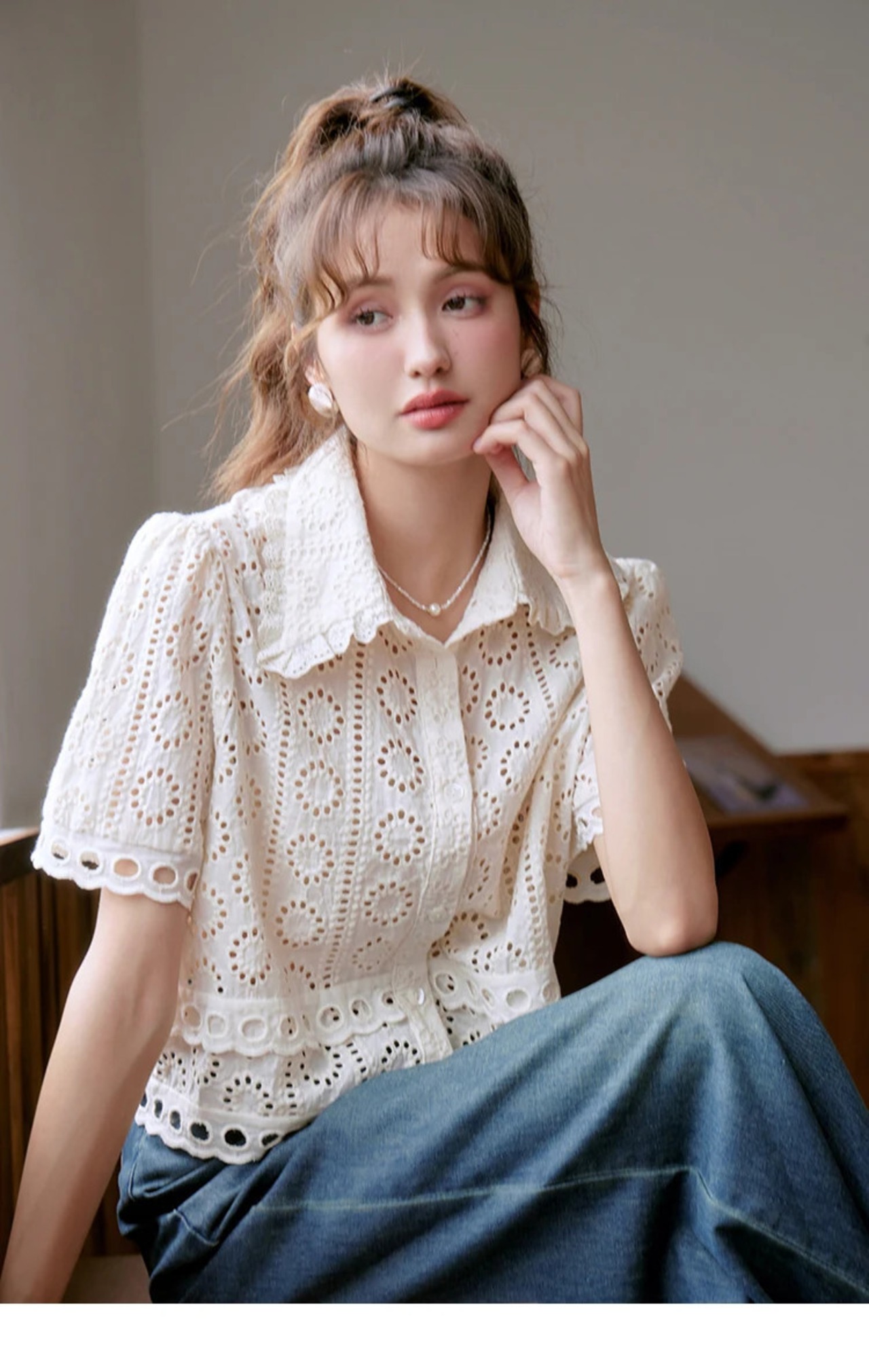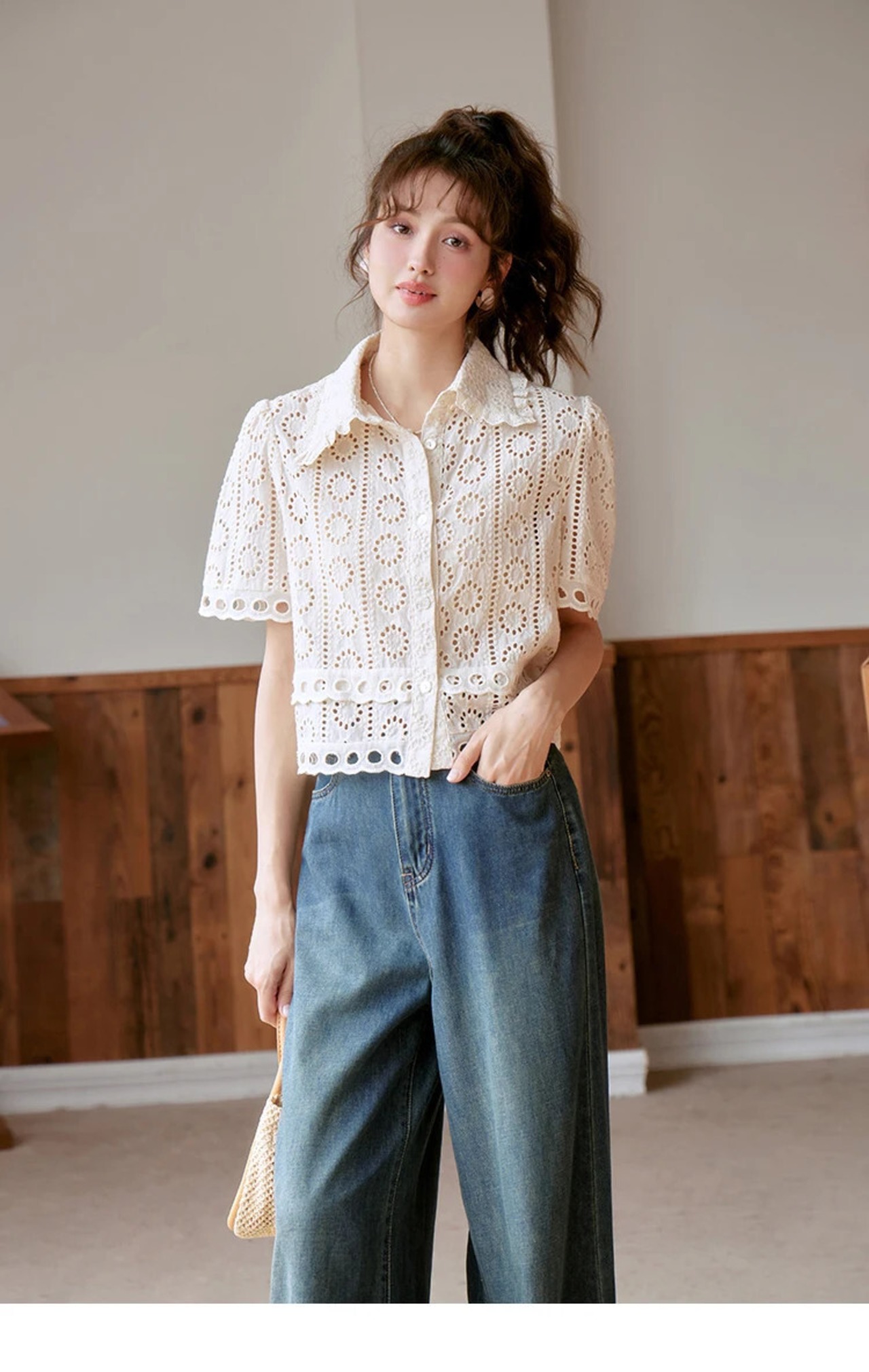 送料無料 MISHOW 女性の気質中空アウトシャツ 2023 夏ポロネックレースルーズシェルボタンシングルブレストトップス MXC39C0092 サマー 夏物 Oネック AE12125556677618654500772 | 女性の為の通販サイト-fashion navi