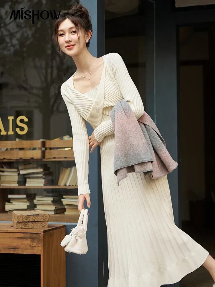 送料無料 MISHOW レディース ツイストリブニットドレス 2023 秋冬フレンチ U ネックミドル丈ドレスフリル裾 MXC52L1627 オータム 秋物 ウィンター 冬物 AE12125556677622797208025