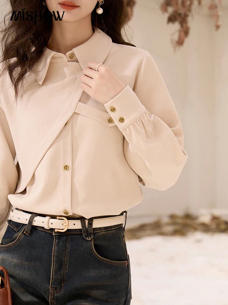 送料無料 MISHOW レトロ長袖シャツ女性春秋ボタンアップブラウス女性ルーズ不規則な多用途トップ MXC58C0176 ロング スプリング 春物 オータム 秋物 AE12125556677610965711592
