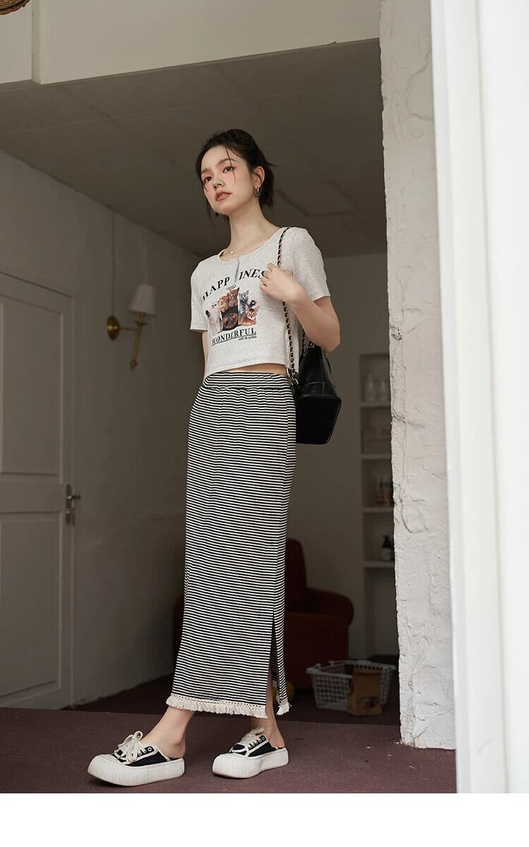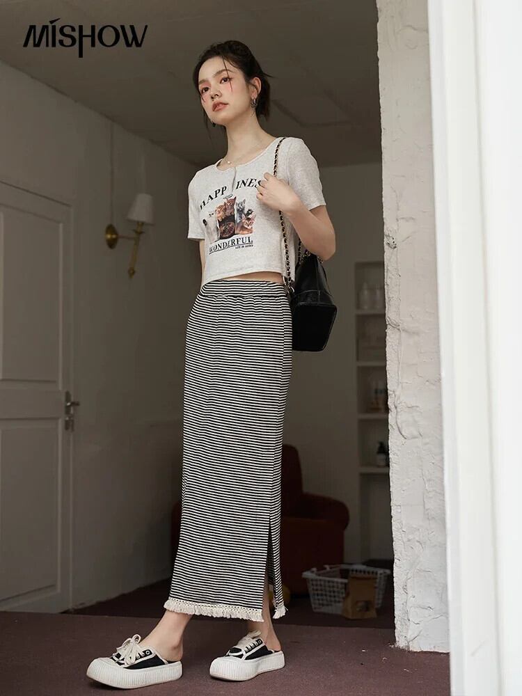 送料無料 MISHOW ストライプテルストレートニットスカート女性 2023 夏 A ライン弾性ウエストサイドスプリット足首丈スカート MXC38B0068 エラスティック 伸縮 サマー 夏物 Aライン AE12125556677644686942931