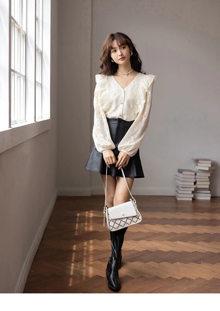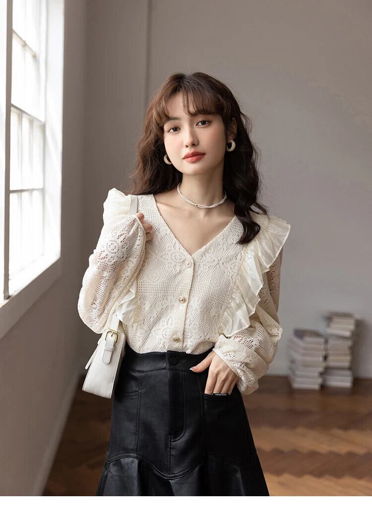送料無料 MISHOW レースブラウス女性 2023 秋フレンチ V ネックフリル長袖かぎ針編み中空アウトシャツシックな MXB35X0351 ロング オータム 秋物 Vネック AE12125556677651892769097