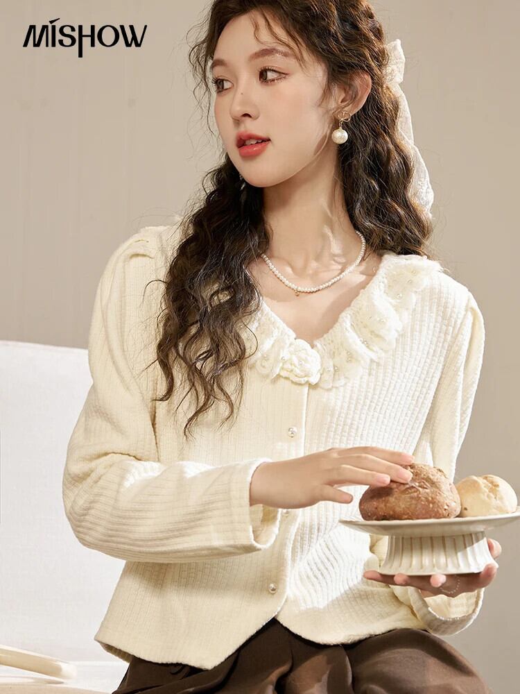 送料無料 MISHOW ニットカーディガン女性ニットパフスリーブフリルネックセーター女性フレンチ優しい模造カシミヤトップス MXC59X1412 AE12125556677659676120869