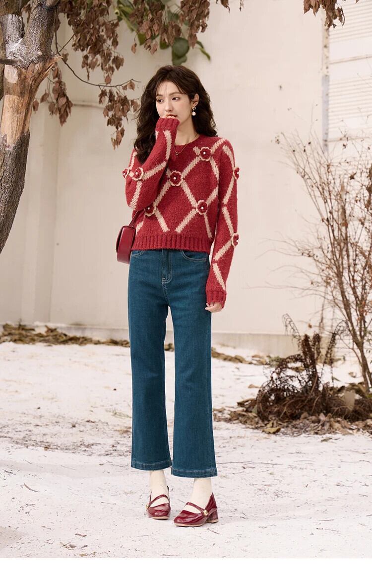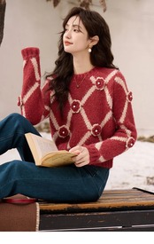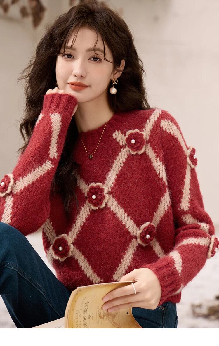 送料無料 MISHOW ラウンドネック菱形ジャカードセーター女性秋冬プルオーバールーズコントラストかぎ針編みニットトップスジャンパー MXC59Z0488 オータム 秋物 ウィンター 冬物 Oネック AE12125556677698056777010