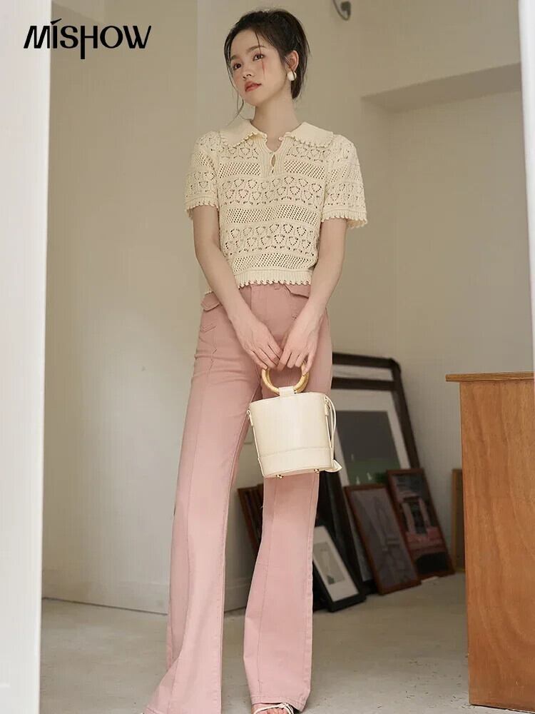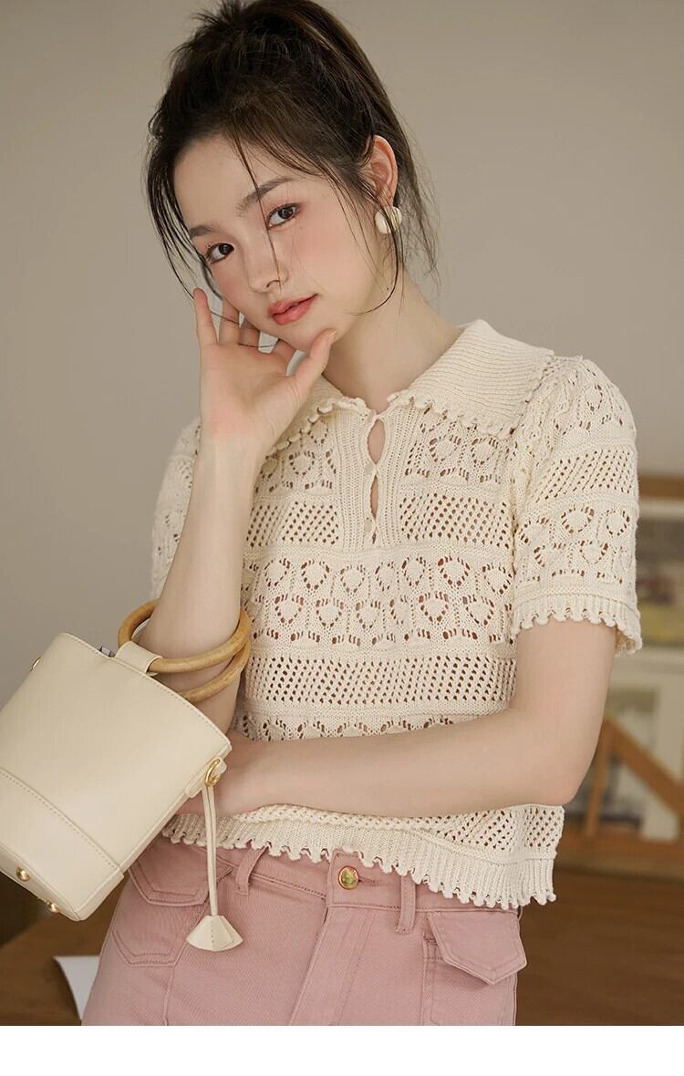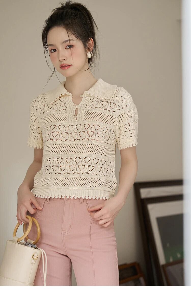 送料無料 MISHOW 中空アウトポロネックトップ女性の夏 2023 フレンチスイートニットソリッドルーズレトロ Tシャツオフィスレディ MXC33Z0069 大人ガーリー スウィート キュート カジュアル サマー 夏物 ソリッドカラー 会社 学校 通勤や通学にも AE12125556677662641735373