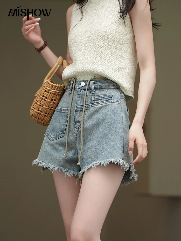 送料無料 MISHOW レディース テル デニム ショーツ 2023 夏 ウエスト 綿 100 巾着 ダメージ加工 ルーズ ショーツ MXC33K0018 コットン サマー 夏物 ブルマー AE12125556677641480450603