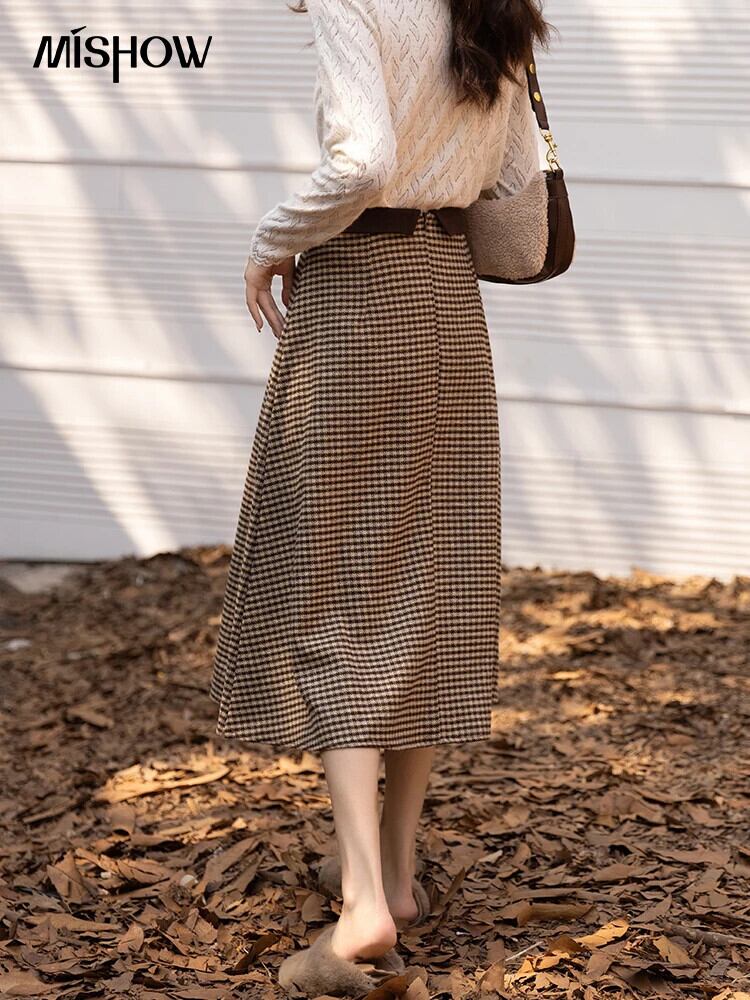 送料無料 MISHOW チェック柄ニットスカート 2023 秋ウエスト A ラインプリーツロングスカート女性 MXB41B0463 オータム 秋物 Aライン AE12125556677653369176889