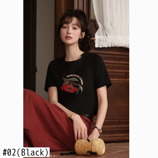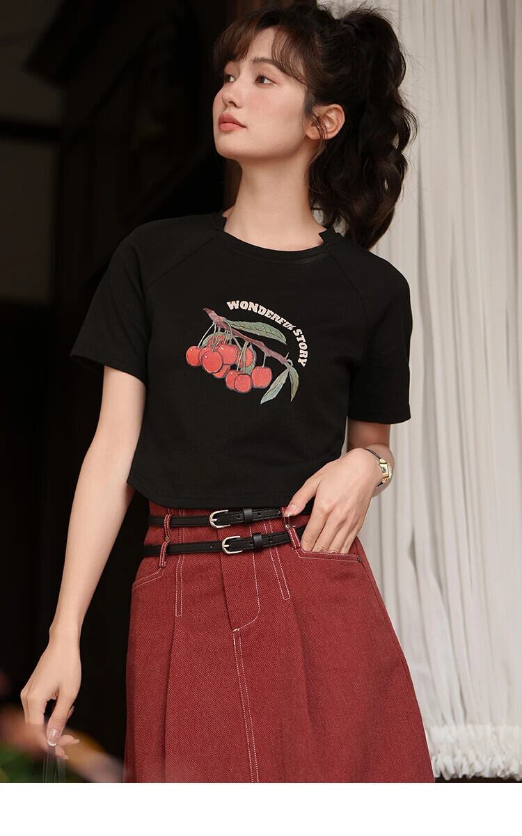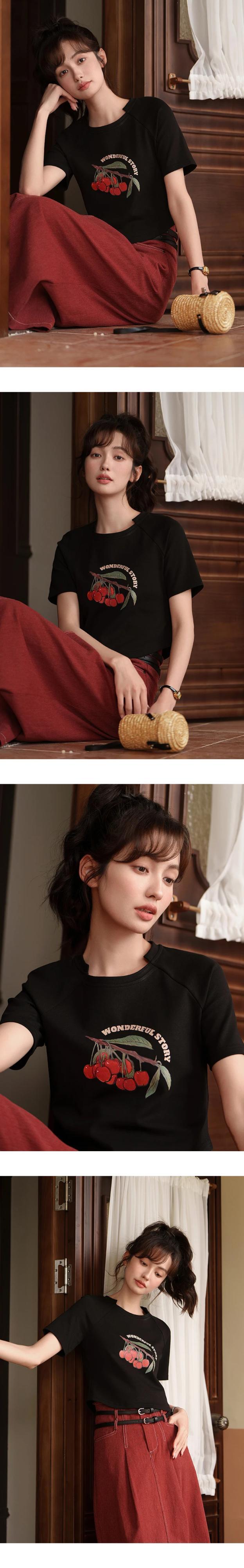 送料無料 MISHOW チェリープリント半袖 Tシャツ 2023 夏不規則な O ネック Tシャツトップスオフィスレディ MXC34T0019 ショート ハーフスリーブ サマー 夏物 Oネック 会社 学校 通勤や通学にも AE12125556677657610869981