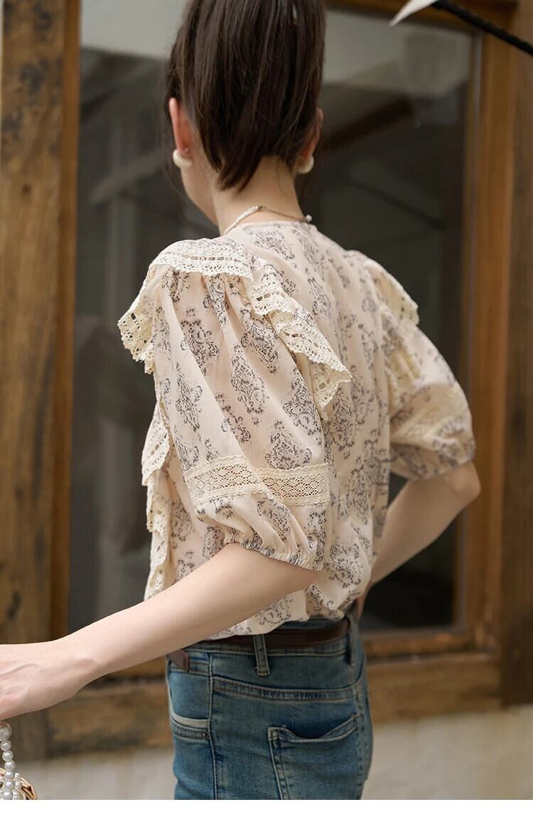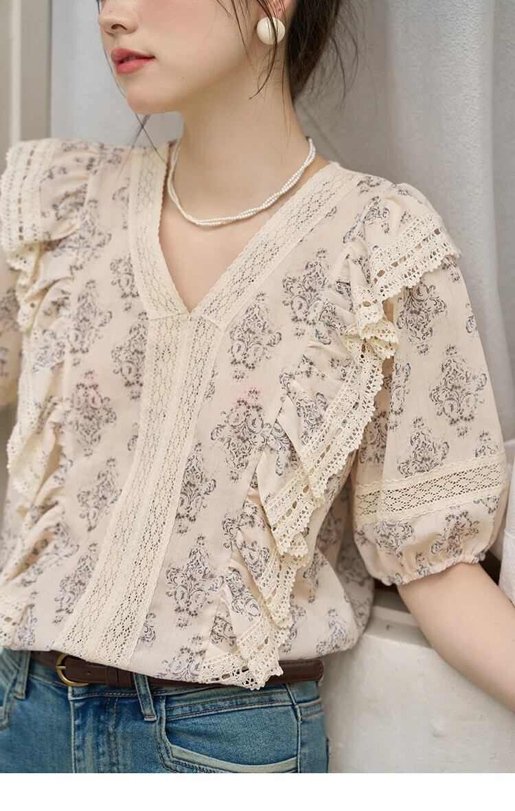 送料無料 MISHOW レースフリル V ネックブラウス女性夏花パフスリーブプルオーバーシフォントップスオフィスレディ MXC35X0068 サマー 夏物 花柄 Vネック 会社 学校 通勤や通学にも AE12125556677652880094027