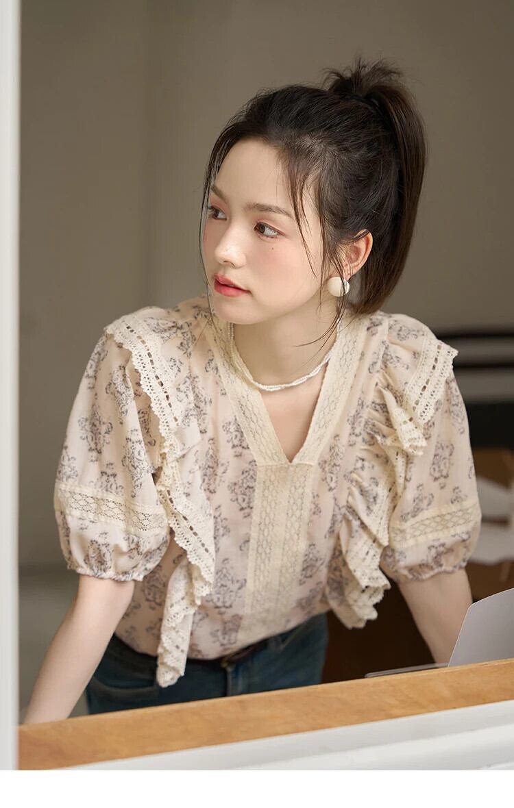 送料無料 MISHOW レースフリル V ネックブラウス女性夏花パフスリーブプルオーバーシフォントップスオフィスレディ MXC35X0068 サマー 夏物 花柄 Vネック 会社 学校 通勤や通学にも AE12125556677652880094027 | 女性の為の通販サイト-fashion navi