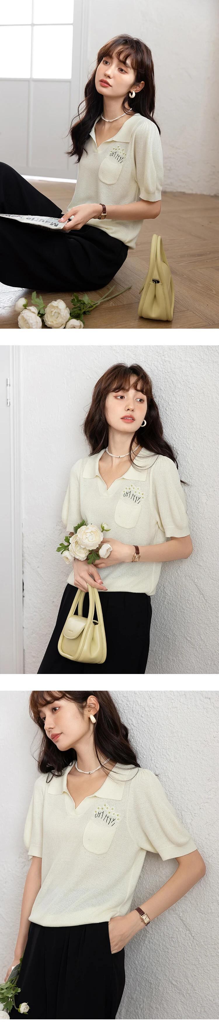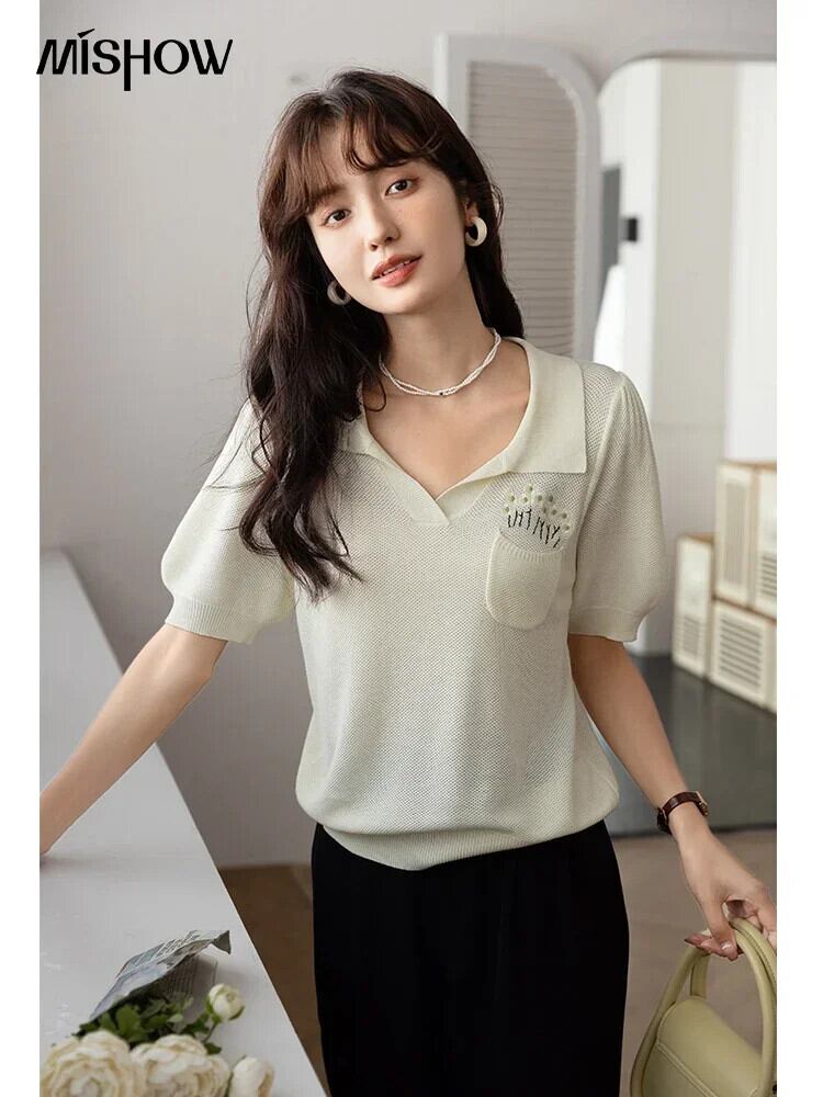 送料無料 MISHOW ニット Tシャツ女性の夏薄型ポロネックパフ半袖プルオーバー刺繍 Tシャツトップス MXB25Z0470 ショート ハーフスリーブ サマー 夏物 AE1212555667763055461038