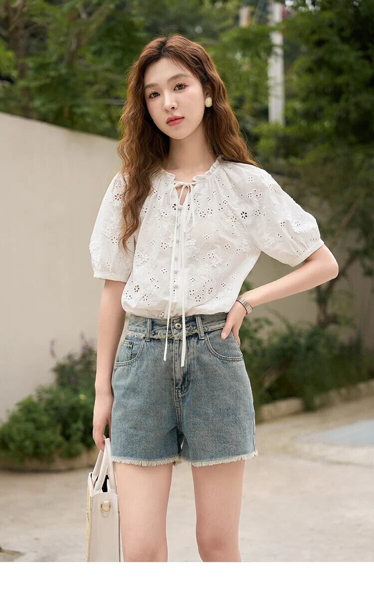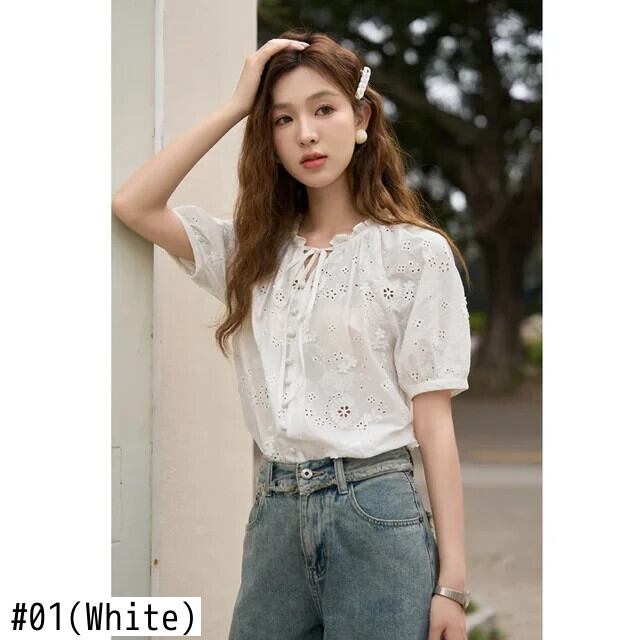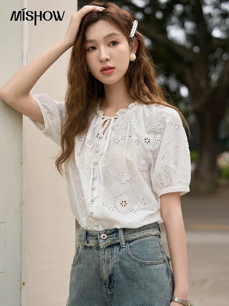 送料無料 MISHOW 刺繍甘いブラウス女性 2023 夏綿 100 パフスリーブレースアップ V ネック中空アウトソリッドトップス MXC34C0019 レッド コットン 大人ガーリー スウィート キュート カジュアル サマー 夏物 Vネック ソリッドカラー AE12125556677679976341441
