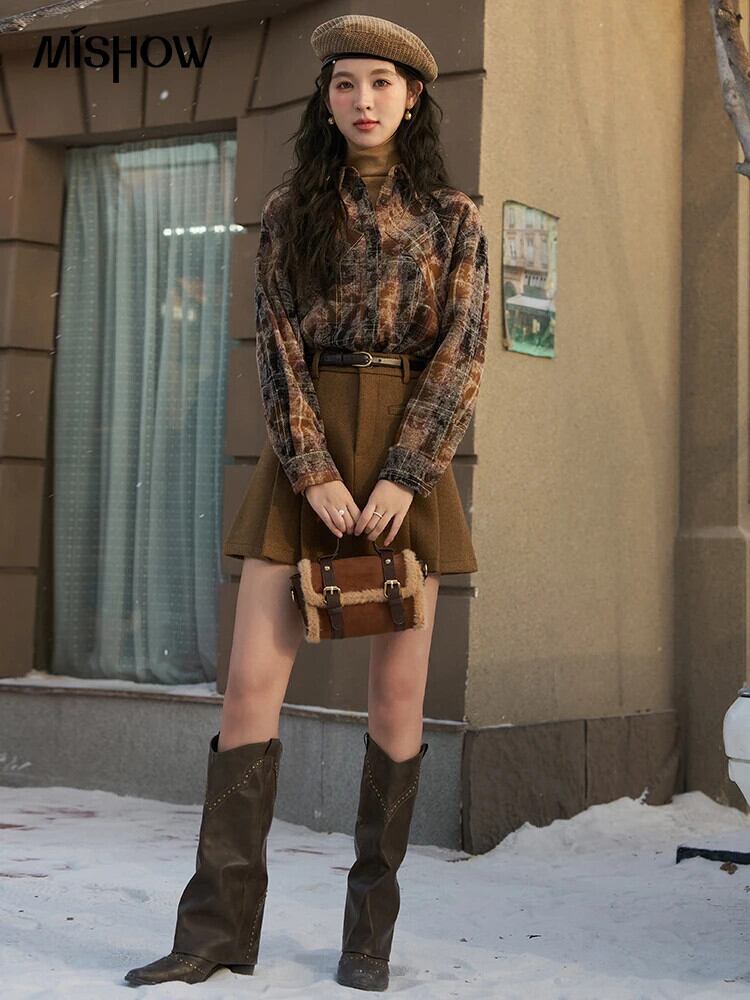 送料無料 MISHOW 綿 100% ボタンアップチェック柄シャツ女性 2023 冬ポロ長袖シャツ & ブラウスオフィス MXC56C0135 ロング コットン ウィンター 冬物 会社 学校 通勤や通学にも AE12125556677698341140815