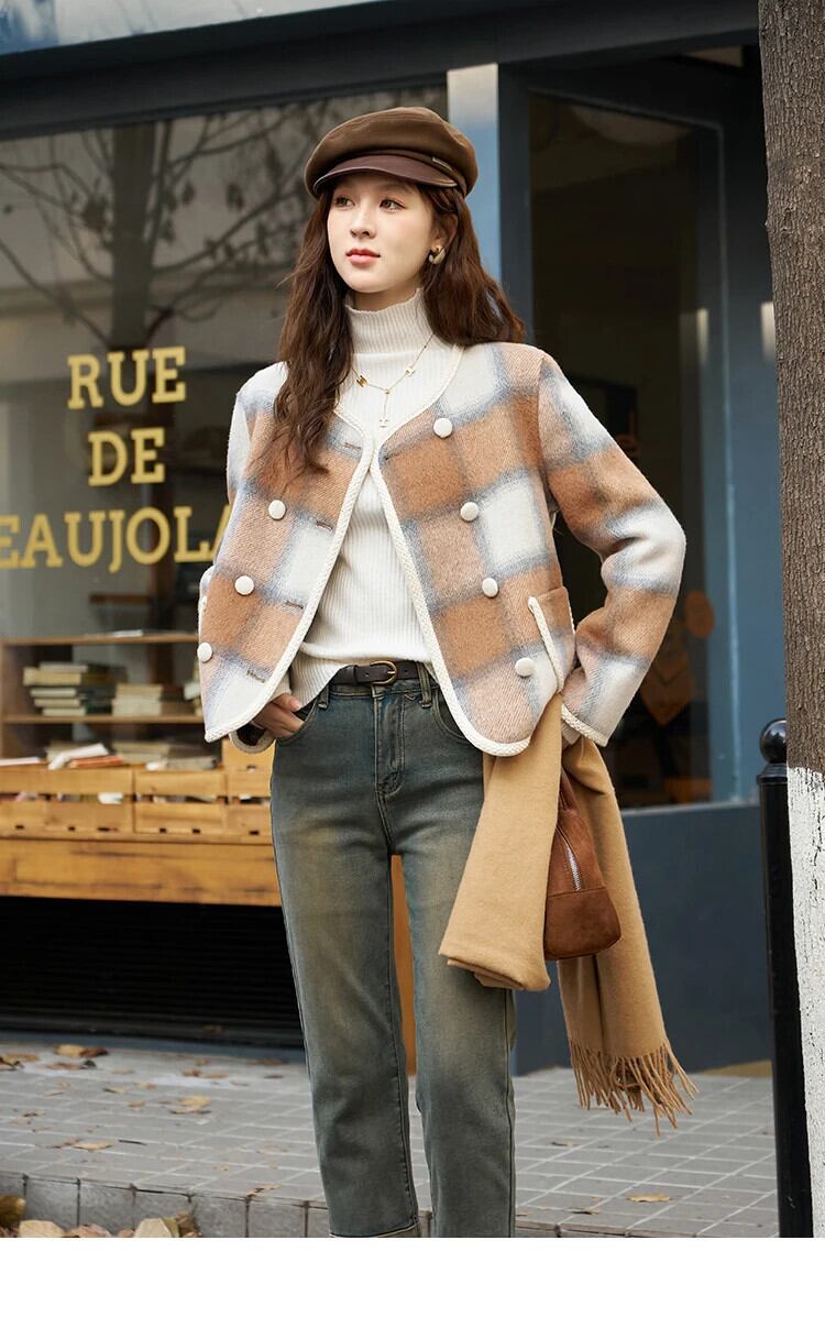 送料無料 MISHOW レディース レトロ チェック柄 ウール コート 秋冬 ウール ラウンドネック クロップド オーバーコート シングルブレスト アウター トップ MXC53W0214 オータム 秋物 ウィンター 冬物 Oネック AE12125556677635821442409