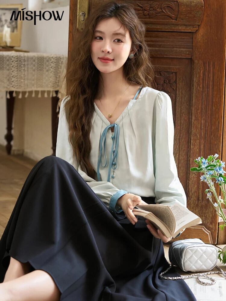 送料無料 MISHOW 2024 春 V ネックシフォンシャツ女性ボタンアップ長袖ブラウスフレンチレースアップ優しいトップス MXD11X1340 ロング スプリング 春物 Vネック AE12125556677651407848954