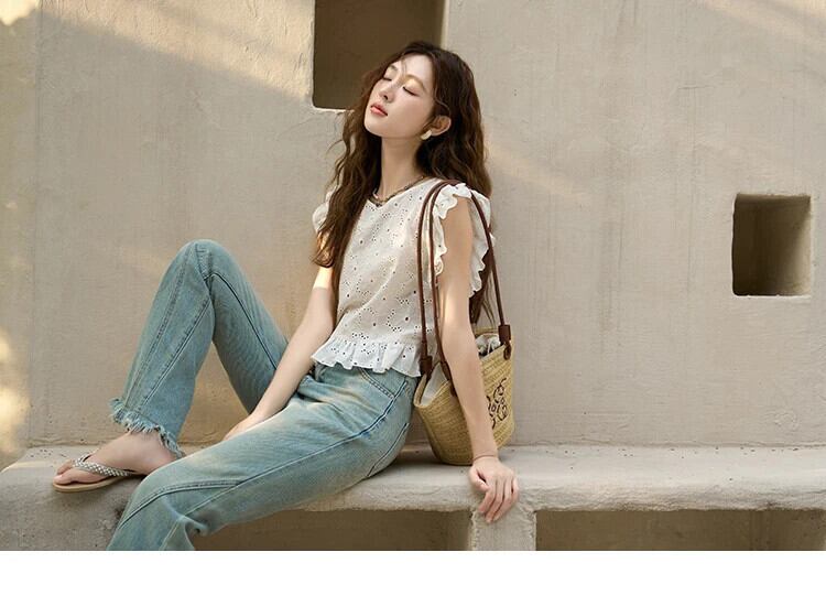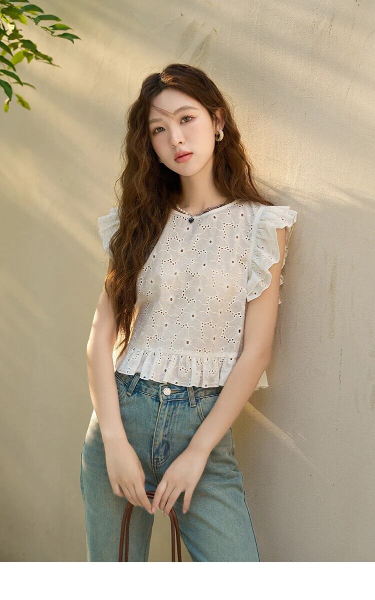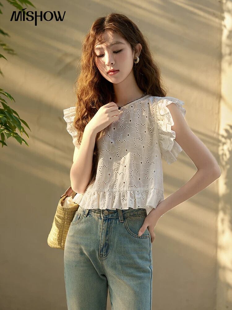 送料無料 MISHOW レースブラウス 2023 夏フレンチ綿 100 甘いフライングスリーブソリッドノースリーブ中空アウト O ネックトップス MXC38X0059 コットン 大人ガーリー スウィート キュート カジュアル サマー 夏物 Oネック ソリッドカラー AE12125556677641823592943