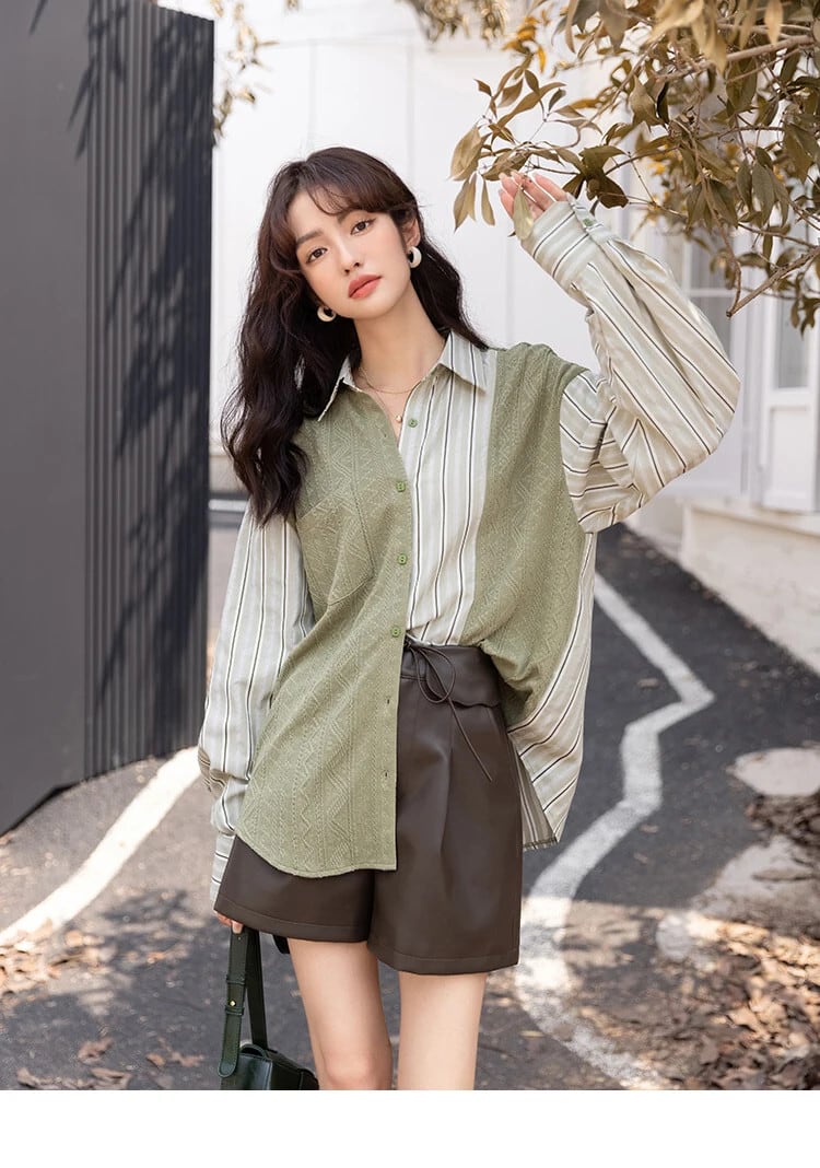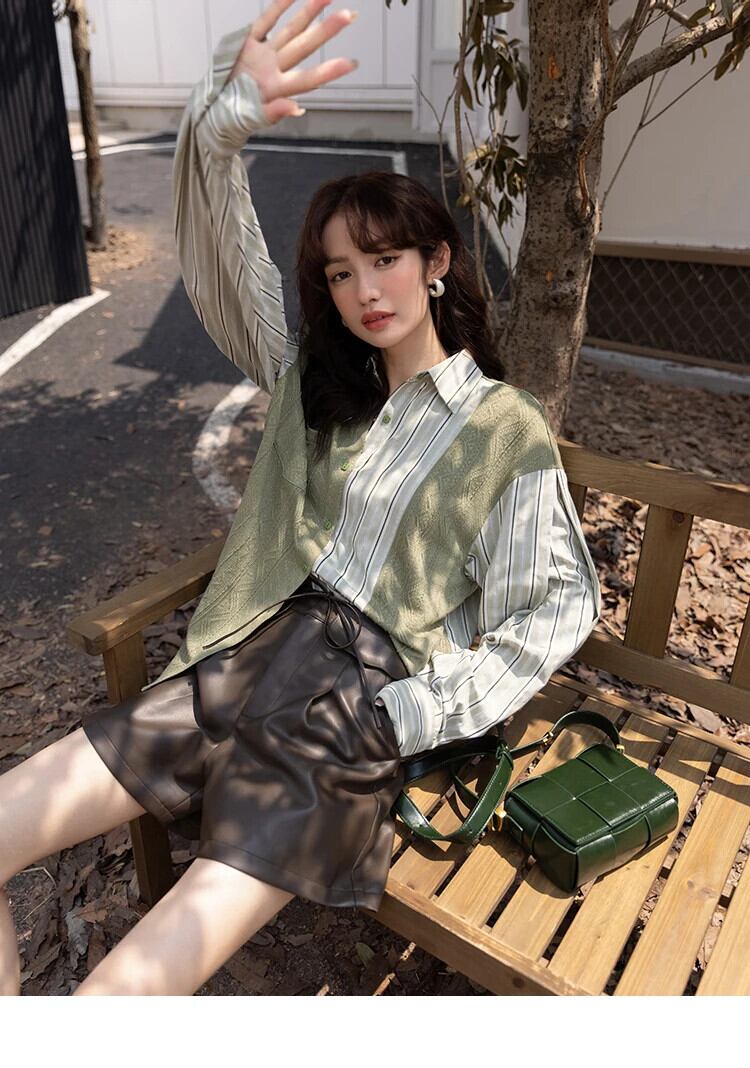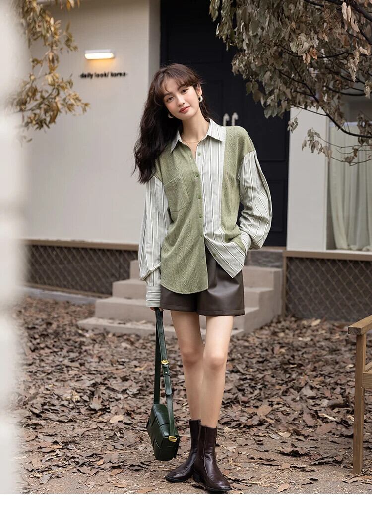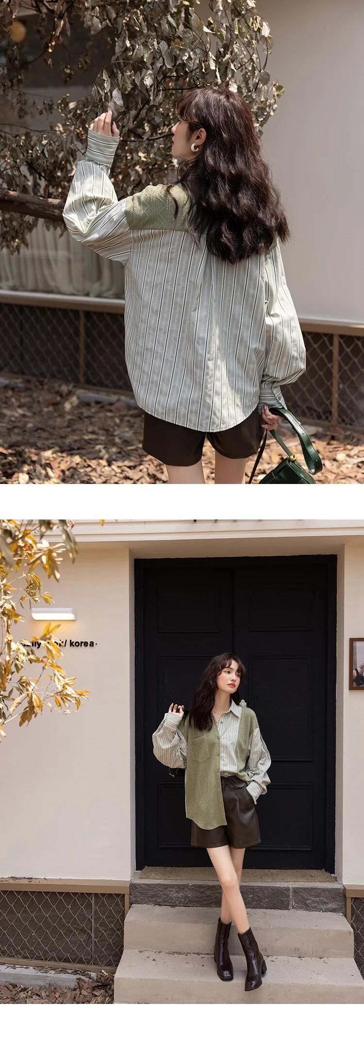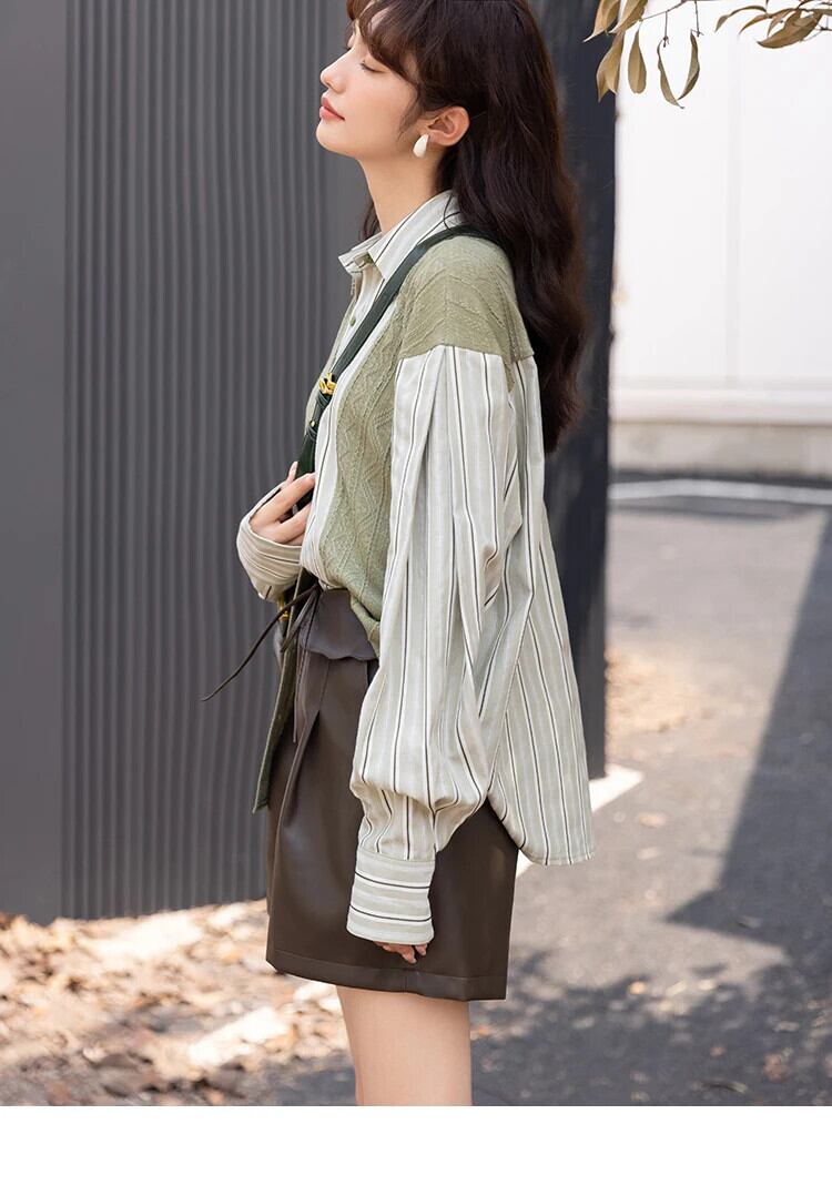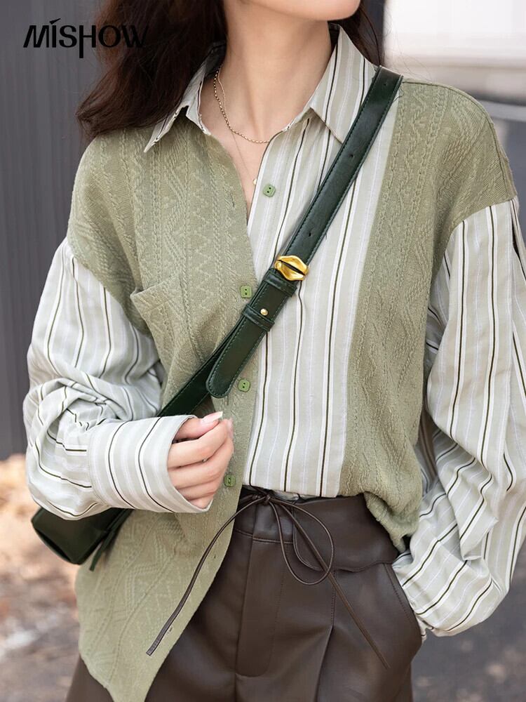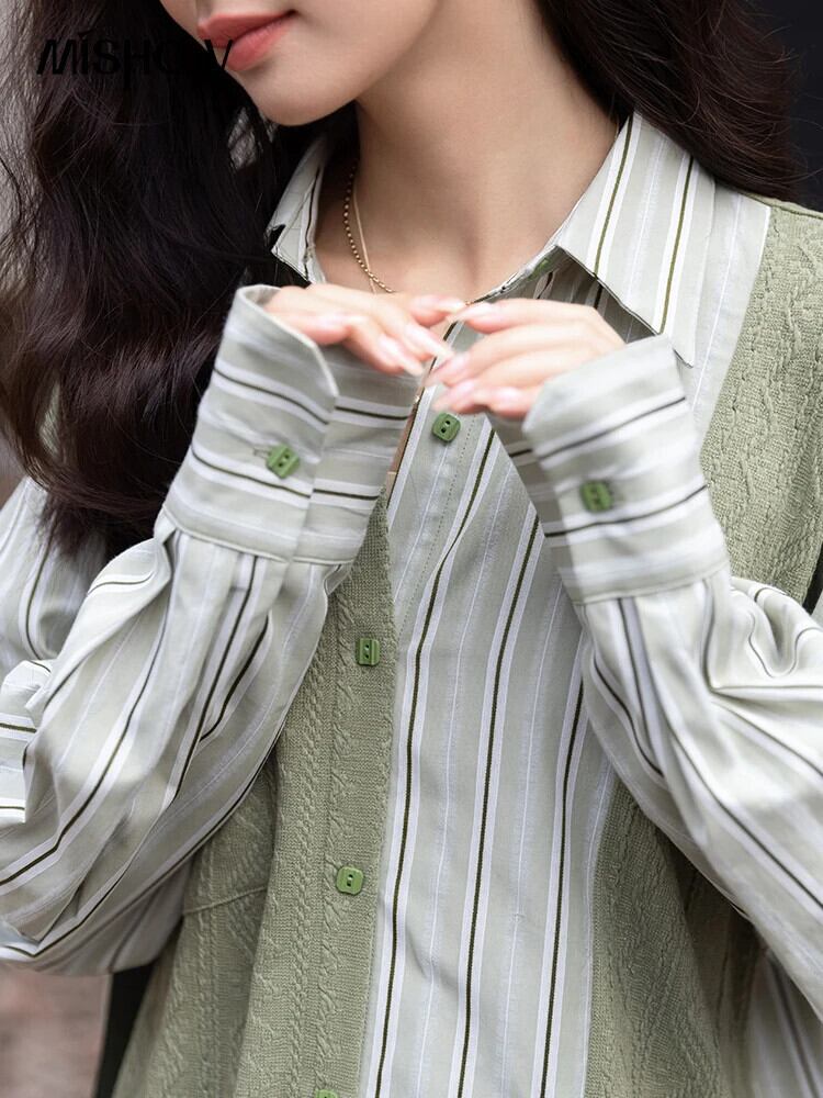 送料無料 MISHOW ブラウス女性 2023 秋ニットパッチワークストライプターンダウンカラーシャツトップス MXB33C0551 オータム 秋物 AE121255566776353865210