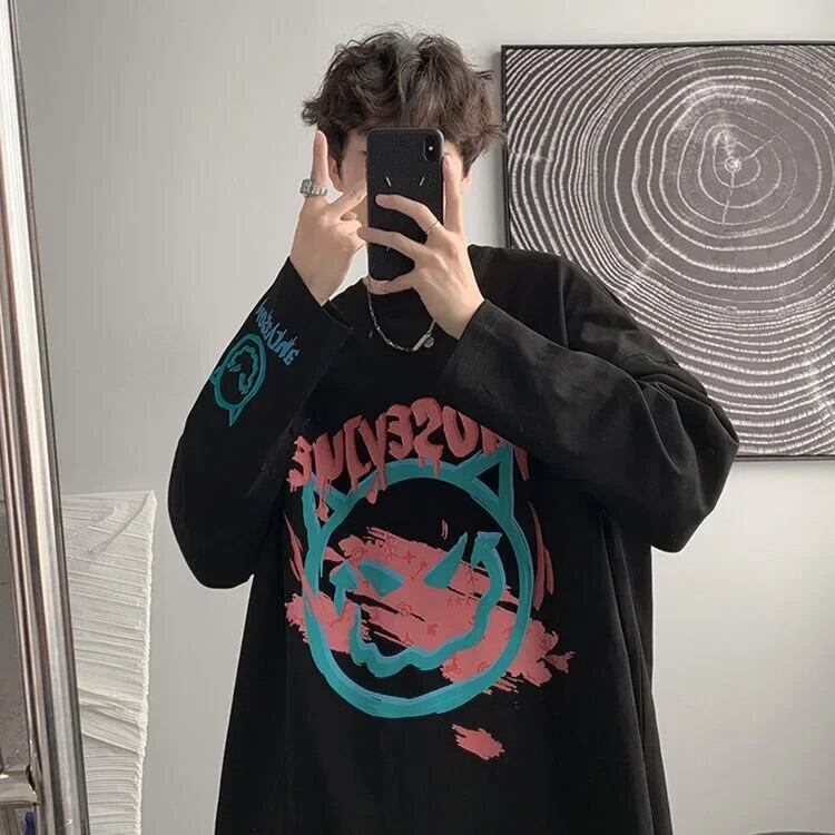 送料無料 Tシャツ男性 2023 トレンドプリント Tシャツ紳士服ヴィンテージ Y2k トップ男性と女性のルーズ特大黒長袖 Tシャツ ロング ブラック ビンテージ AE1212666539351851969