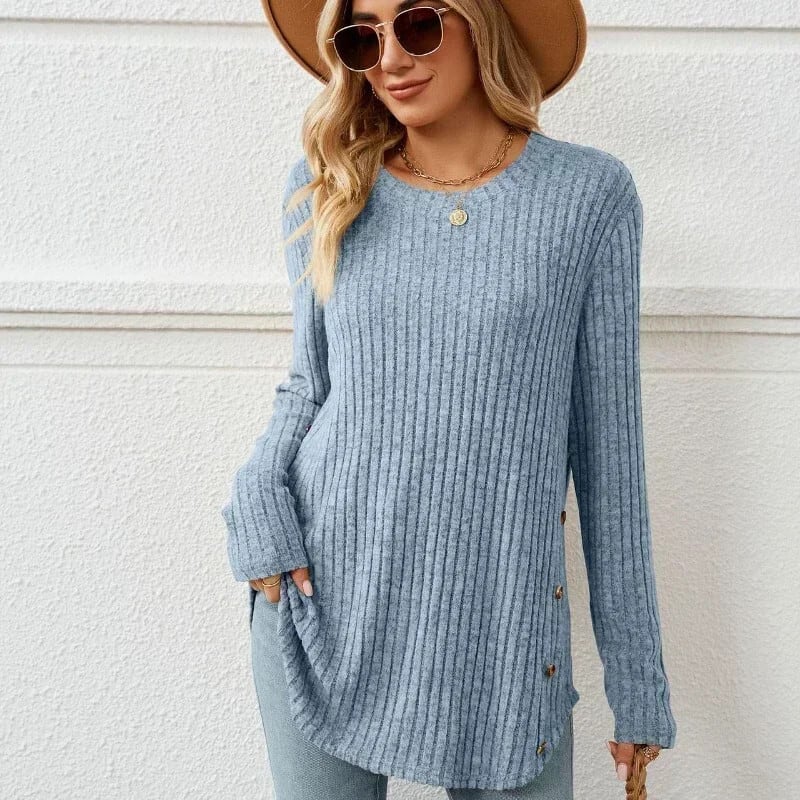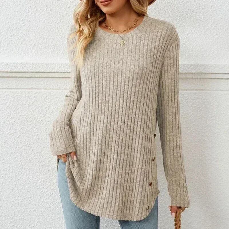 送料無料 冬の長袖女性 Tシャツ O ネックルーズニット底入れ Tシャツ女性女性ソリッドボタン Tシャツ 30116 ロング ウィンター 冬物 Oネック ソリッドカラー AE665656631989681024