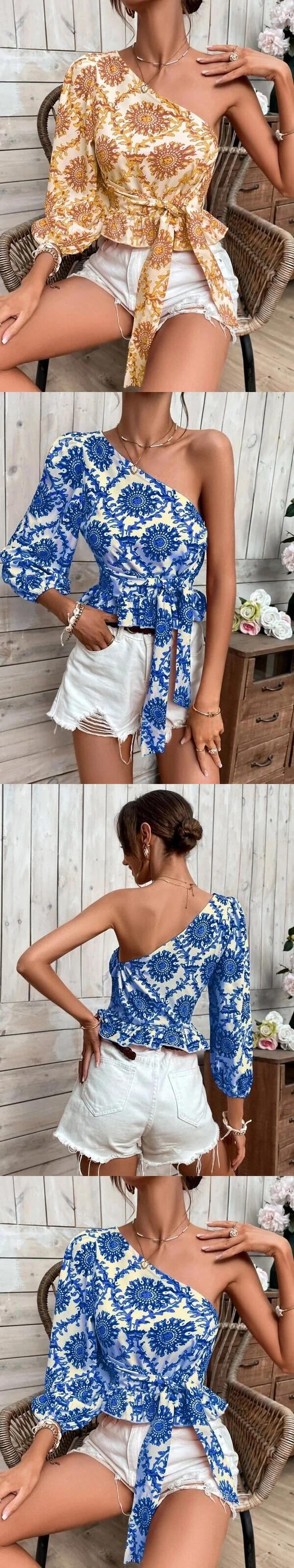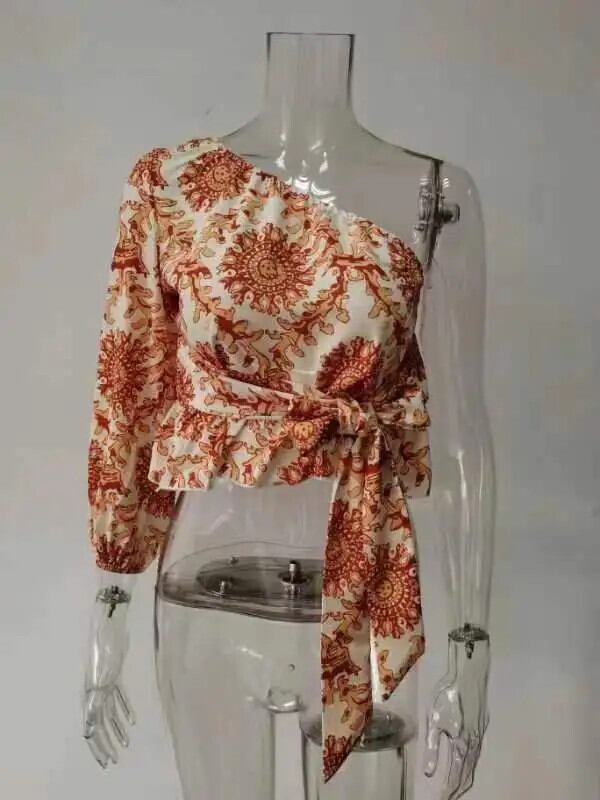 送料無料 春ワンオフショルダーランタンスリーブフリルシャツとブラウス女性 2023 包帯プリントトップス 26708 ラッフル スプリング 春物 AE665656689109416562