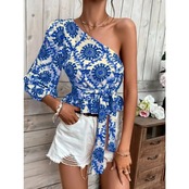 送料無料 春ワンオフショルダーランタンスリーブフリルシャツとブラウス女性 2023 包帯プリントトップス 26708 ラッフル スプリング 春物 AE665656689109416562 | 女性の為の通販サイト-fashion navi