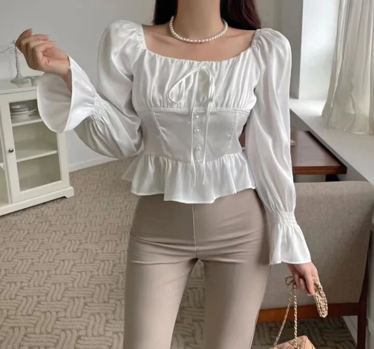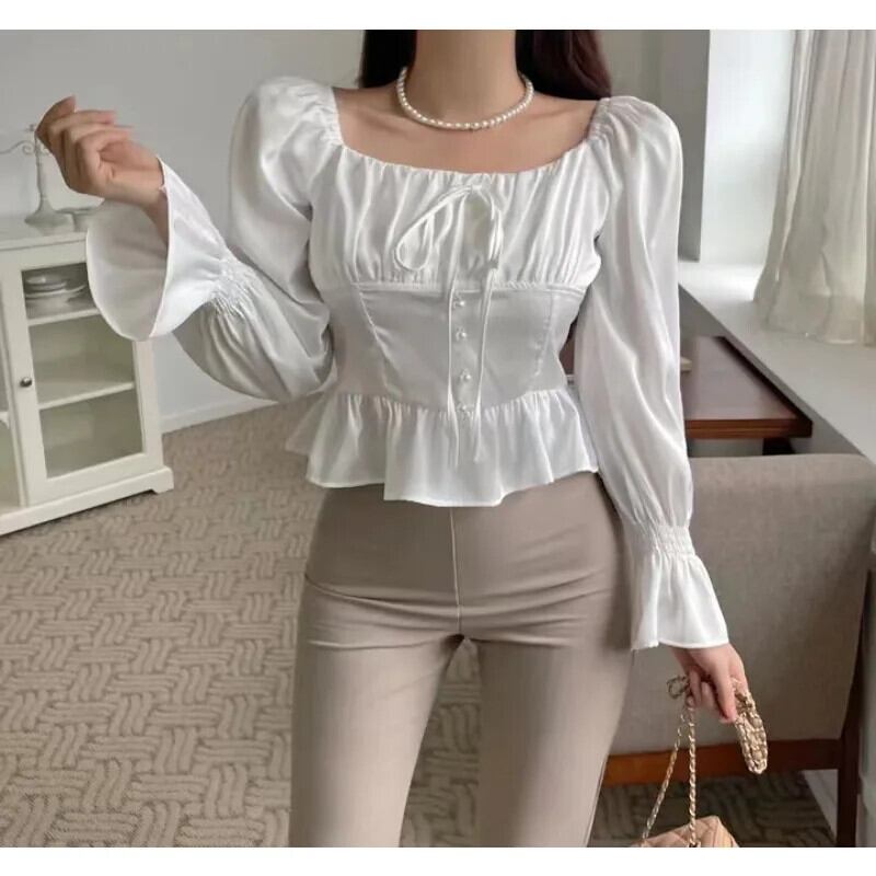 送料無料 スタイルフリルシルク女性のブラウスオフショルダー包帯長袖シャツ秋のセクシーなショートトップ 28888 ロング オータム 秋物 AE665656682152444279 | 女性の為の通販サイト-fashion navi