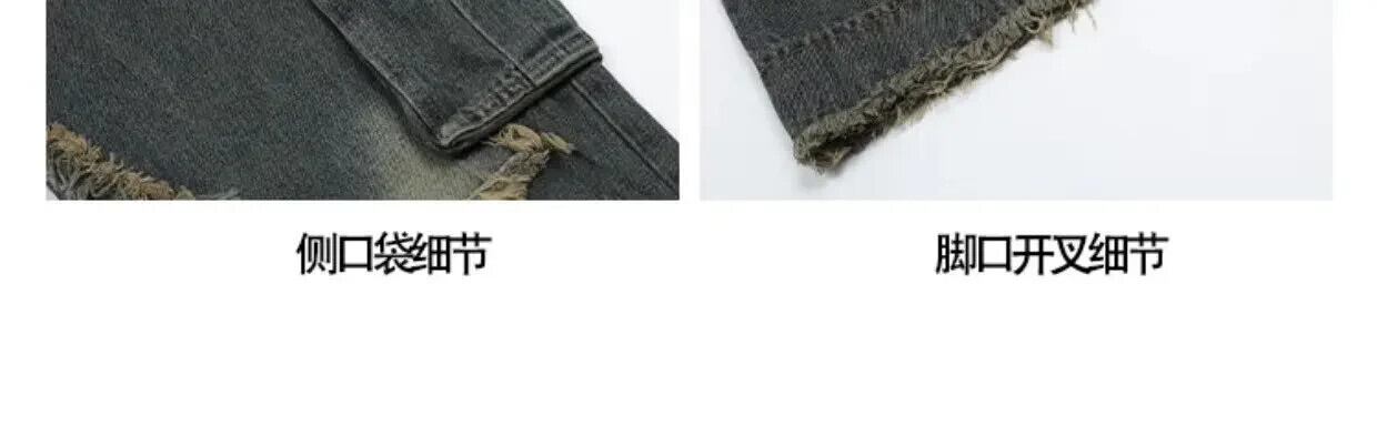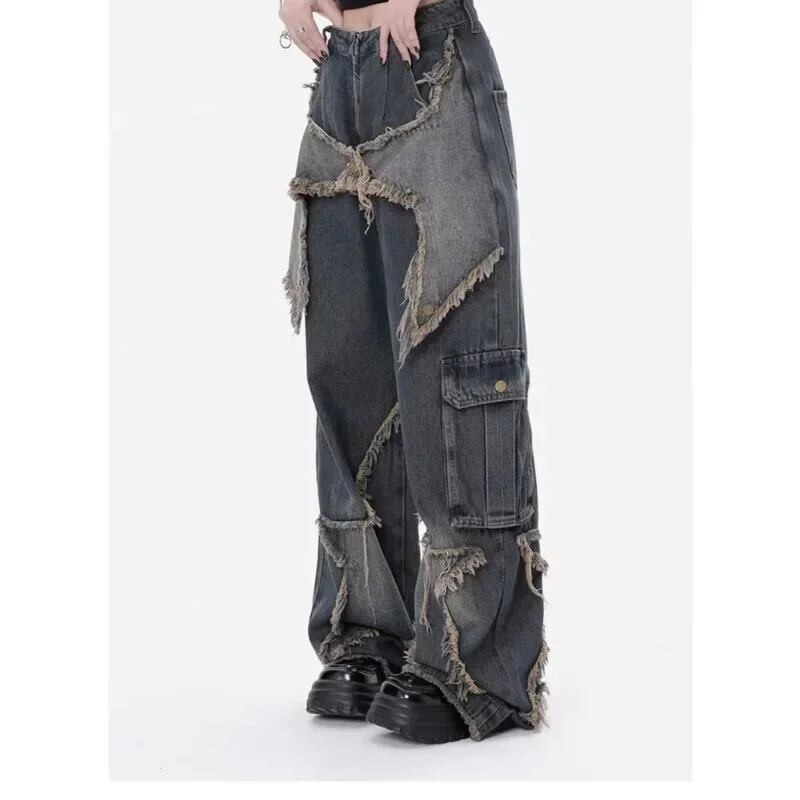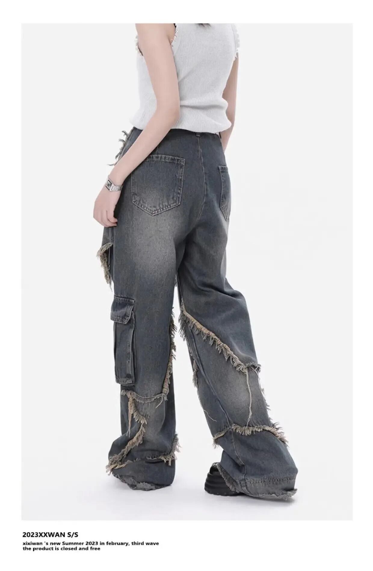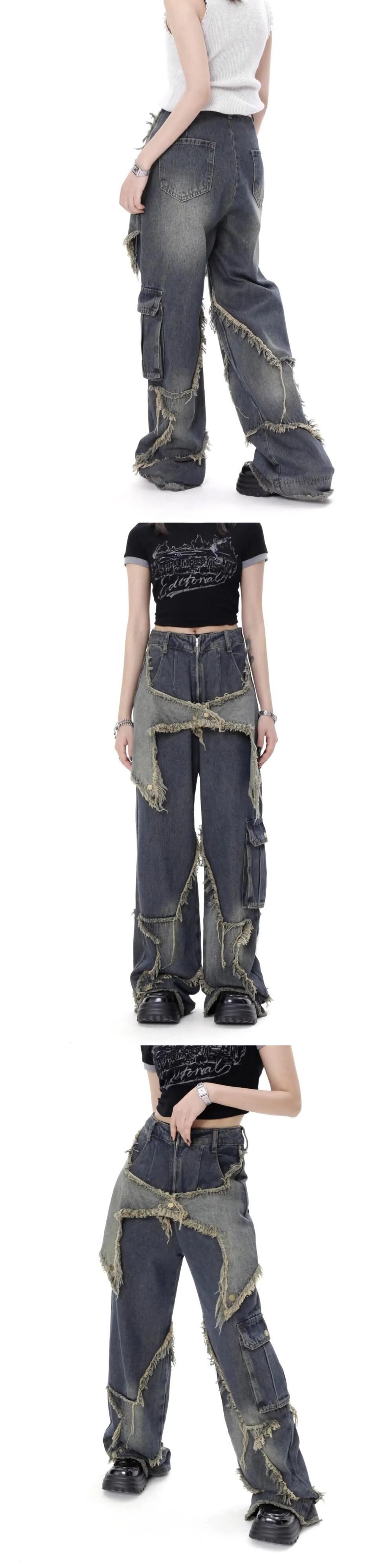 送料無料 2023 ルーズワイドレッグロングパンツヴィンテージ不規則なリッピングウエスト薄型デニムジーンズ女性 30343 ビンテージ AE665656623879925302