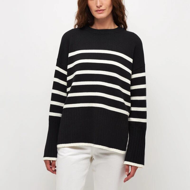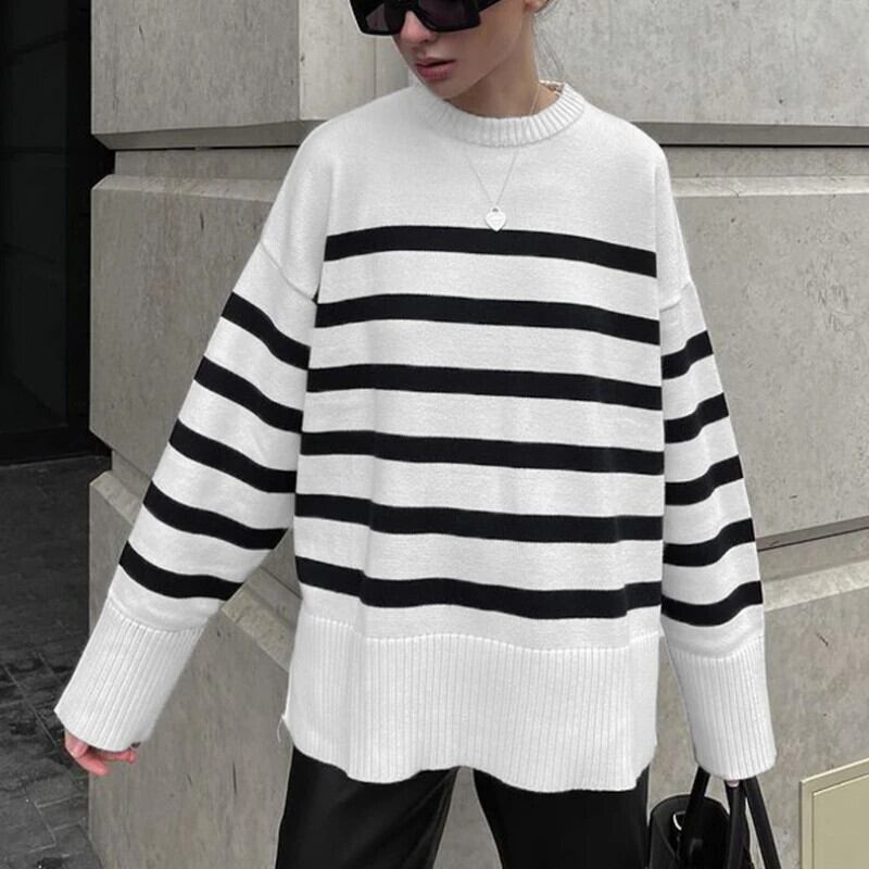 送料無料 2023 冬ストライプニットルーズセーター女性プルオーバートップ秋長袖ストリートニット 28447 ロング オータム 秋物 ウィンター 冬物 AE665656634694748001