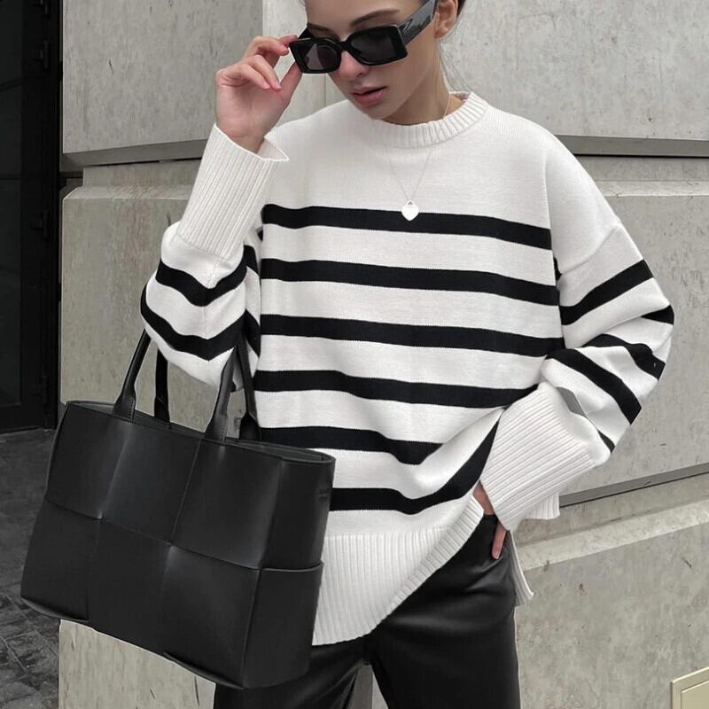 送料無料 2023 冬ストライプニットルーズセーター女性プルオーバートップ秋長袖ストリートニット 28447 ロング オータム 秋物 ウィンター 冬物 AE665656634694748001 | 女性の為の通販サイト-fashion navi