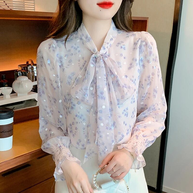 送料無料 春の女性の白いシフォン ブラウス オフィス レディー トップス リボン付き長袖甘いシャツ 24691 ロング ホワイト 大人ガーリー スウィート キュート カジュアル スプリング 春物 会社 学校 通勤や通学にも AE665656664944632512