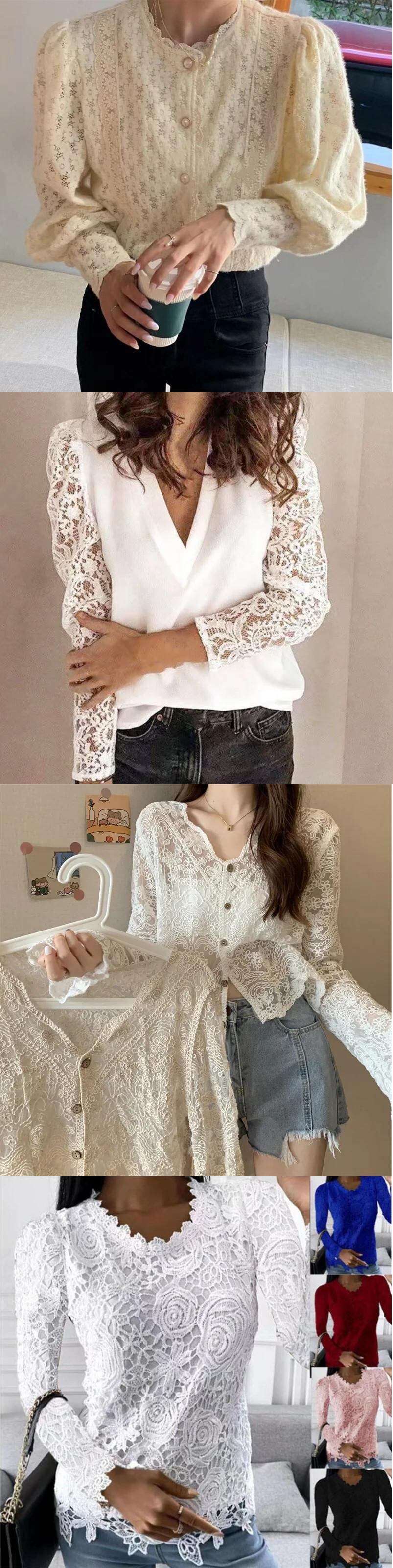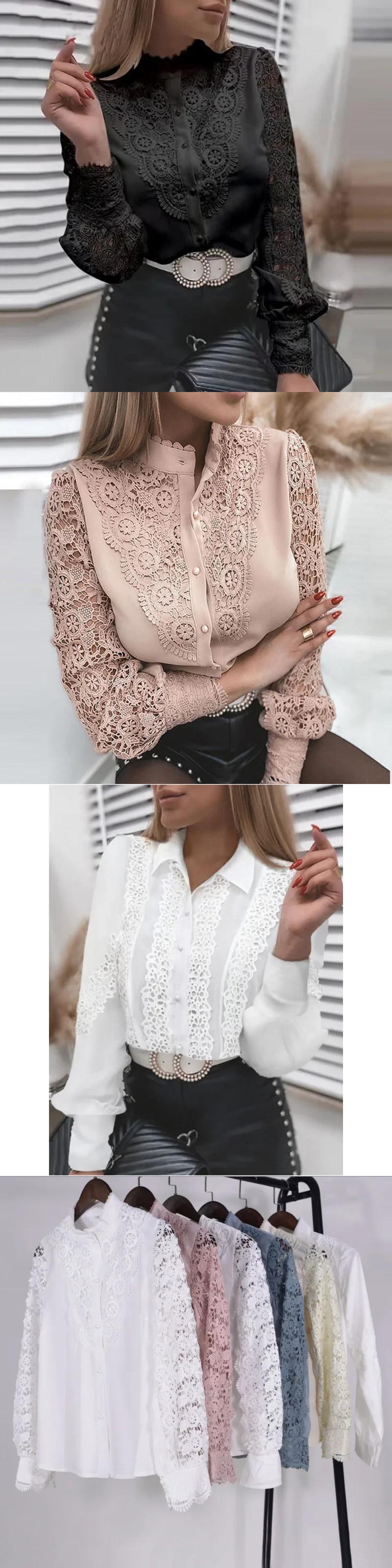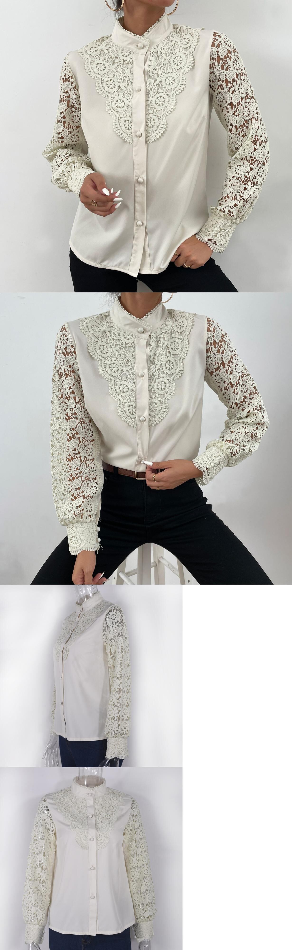 送料無料 2023 女性レーススタンドカラー中空シャツとブラウススタイリッシュな女性トップスボタン白花びら袖 24496 ホワイト AE665656678452139389