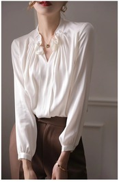 送料無料 女性長袖ヴィンテージシャツ V ネックサテンホワイトブラウス 2023 ルーズシルクプリーツ長袖トップス 26988 ロング Vネック ビンテージ AE665656618288934628
