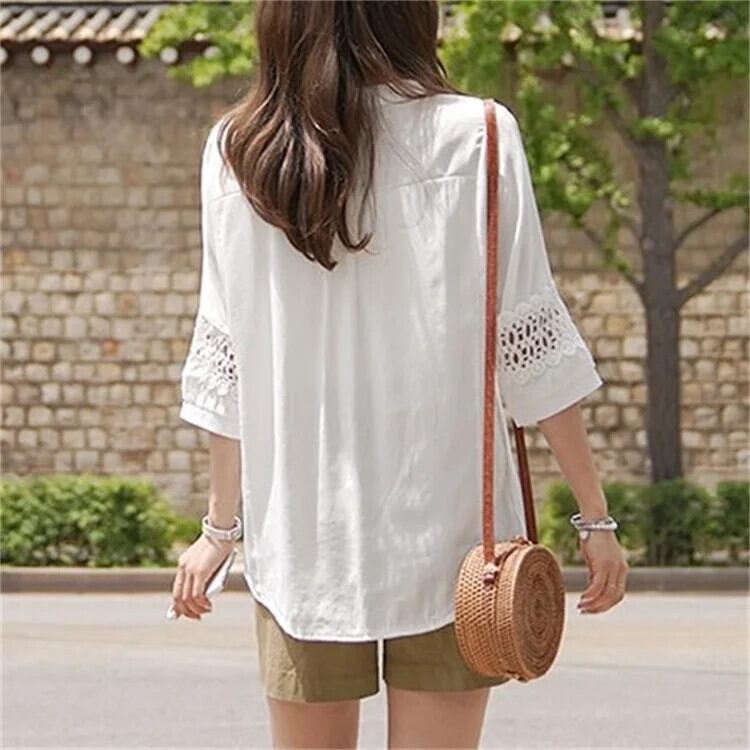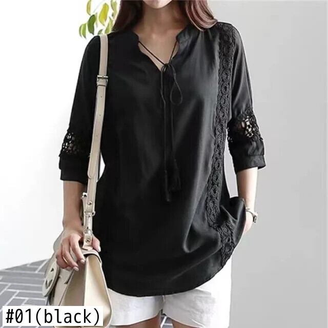 送料無料 春レース中空アウトルーズブラウス女性夏半袖レースアップシャツ固体 26078 ハーフスリーブ スプリング 春物 サマー 夏物 ソリッドカラー AE665656663491764244